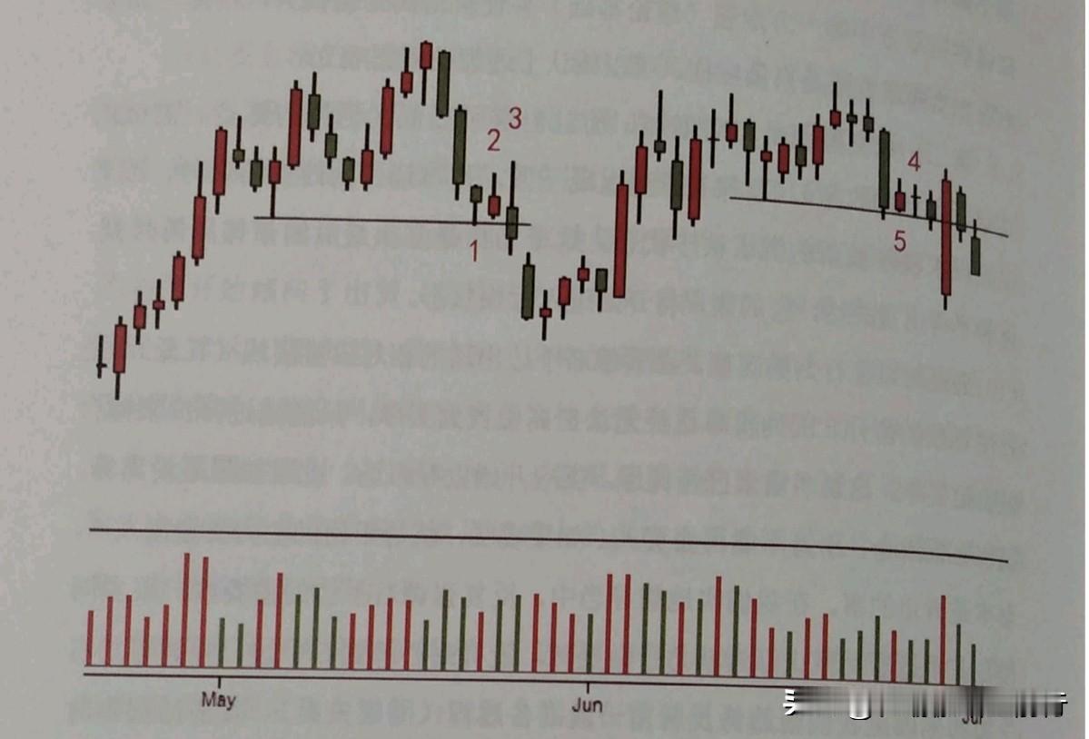 十万想变百万。继续躺。 每日一学:不是所有的支撑都能够成为进场位置 如图所示,支撑上出现了无力反弹,表明支撑价位流入的买单很少,买家对这个价格没有兴趣,不愿意追高,支撑区没有需求导致价格继续向下寻找买家。 判断支撑是否有效,主要看支撑处需求增长的强度。假如你在支撑位进 场买入,说明你假设了这里有大量买单流入而阻止了下跌。如果接下来的几天没有表现出持续的需求,反而是低量小幅波动,说明没有大量愿意追高的买单,那么这个支撑无效,我们应立刻离场等候。 K线1到达支撑位置出现反弹,这是个很好的停止行为。它的振幅小说明下跌幅度缩小,高成交量说明卖单流入很多,但是缩小的振幅说明这么大卖单流入没有结果(需求扩大的导致)。按照习惯,在支撑上出现下跌终止行为,价格应该反弹并上涨。 K线2的涨幅却是非常小,冲高之后收在中部,说明市场没有足够的买单流入来跟随这个反弹。 K线3是供应继续主导市场的信号,上影线说明当日卖单流入量大于买单流入量(供应战胜需求),同时成交量扩大,这说明反弹遇到了强大的供应(主力高抛所致)。结论是支撑无效,导致价格继续下跌。 K线5和4的情况与K线1和2相同,同样是支撑上没有需求接盘并持 续增加,导致支撑失效。 通过K线1、2、3、4的行为,我们知道支撑失效的理论根据成立,预示着后市继续下跌。如果你不幸抢了反弹,看到以上行为,须立刻离场,不要用自己的情绪和希望来否定市场本质行为。通过上述分析,对于进入支 撑区(需求区)时的成交量至关重要。先不管K线如何,高成交量告诉我们供应压力根本没有减少,还具备突破支撑区的能力。如果我们此时买入,等于是跟市场的主控力量作对。好中最好的进场,必须等到价格进入支撑区的时候,供应严重短缺(低量),因为供应短缺是价格上涨的基础。