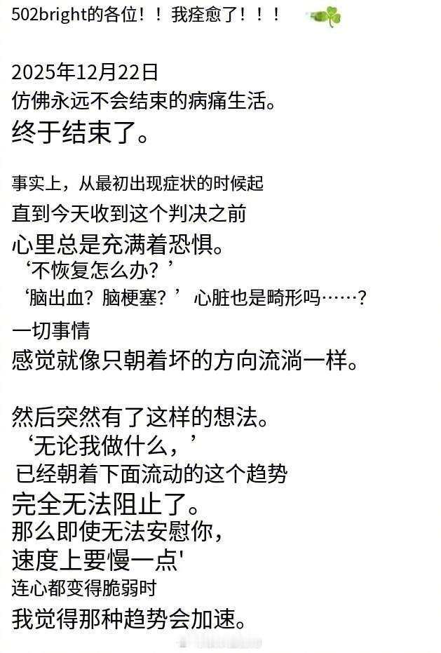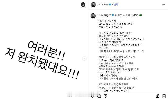巧克力欧巴车贤胜抗癌成功 曾在《单身即地狱》中备受喜爱的“巧克力欧巴”车贤胜在社交平台激动宣布血癌已痊愈!“2025年12月22日,这段仿佛永无止境的抗癌生活终于落幕了。” 他分享了确诊后的恐惧、化疗期间的痛苦,以及“让病程慢下来”的坚强心态。收到痊愈报告时,他感觉自己“像收到了圣诞礼物”,并暖心鼓励所有病友不要放弃笑容与希望。