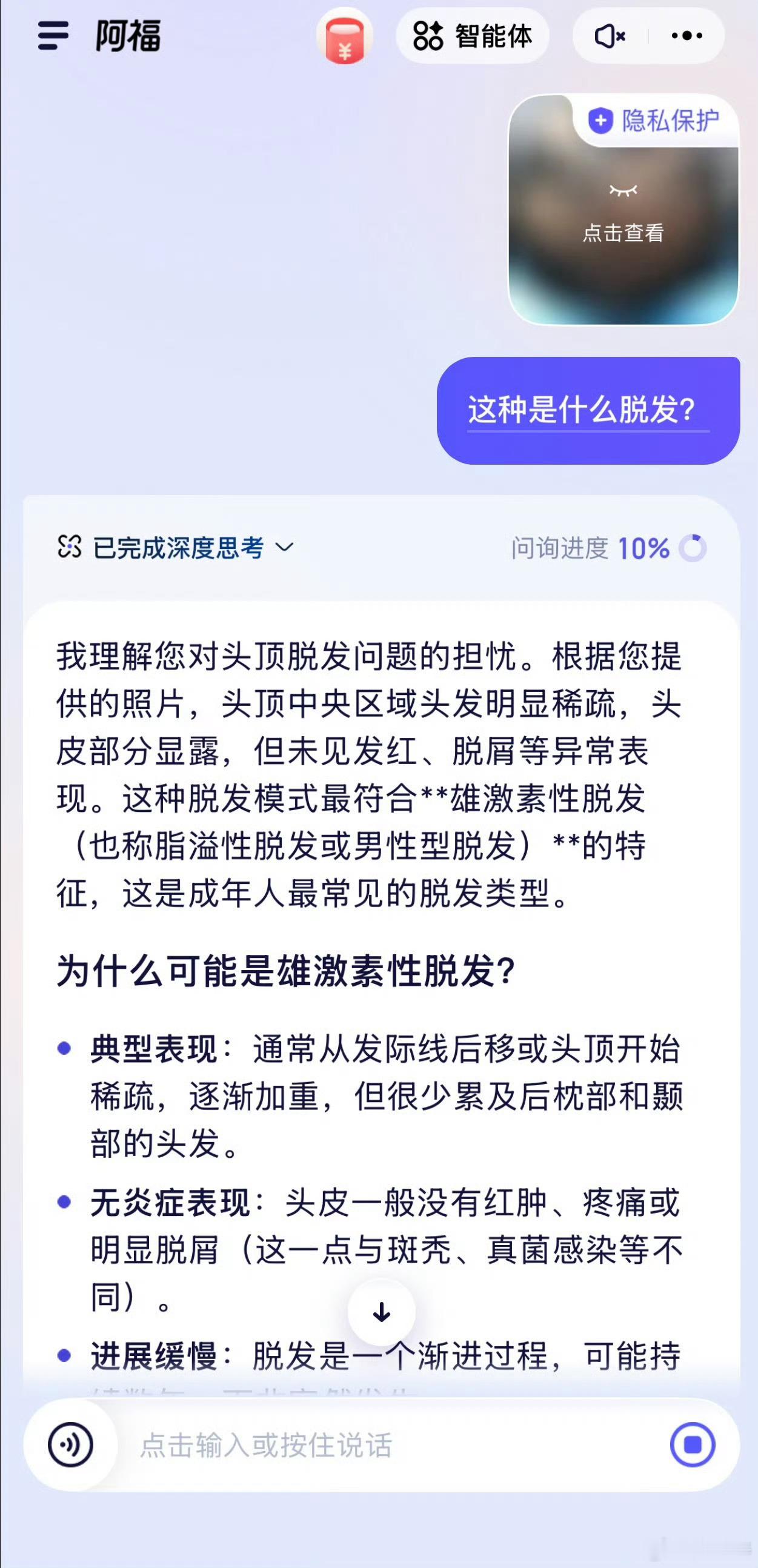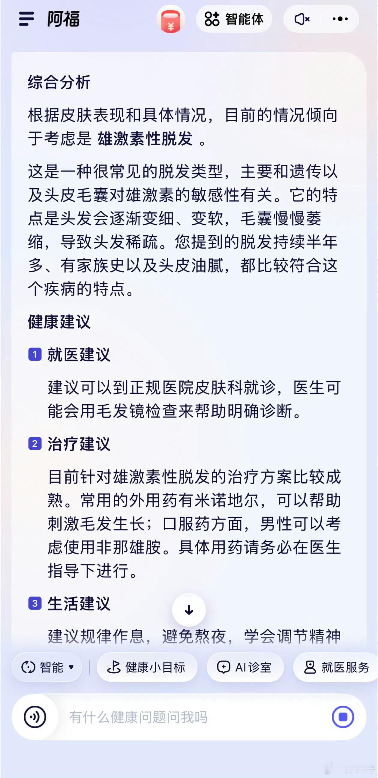 为什么头发说走就走季节性掉发不等于真脱发!焦虑上头后的过度清洁,可能让头皮更敏感。盲目护理前,不如先打开蚂蚁阿福,拍张照测测脱发程度,再让阿福给一版适合自己的防脱养护计划,让头发不再离家出走~