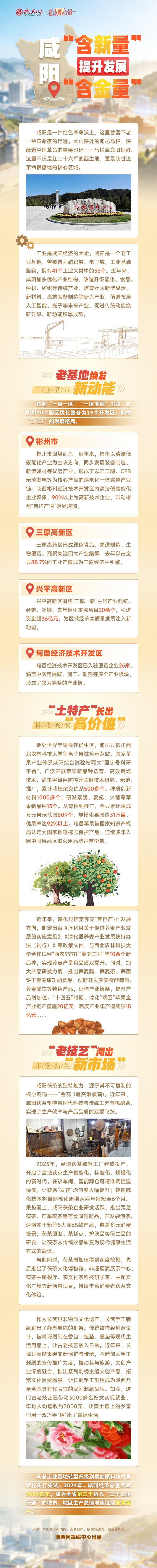 工业是咸阳经济的大梁。咸阳是一个老工业基地,曾被誉为纺织城、电子城,工业基础坚实,拥有41个工业大类中的35个。近年来,咸阳加快优化产业结构,改造升级能化、食品、建材、纺织等传统产业,培育壮大新型显示、新材料、高端装备制造等新兴产业,前瞻布局人工智能、光子等未来产业,促进传统动能焕新升级、新动能积厚成势。
