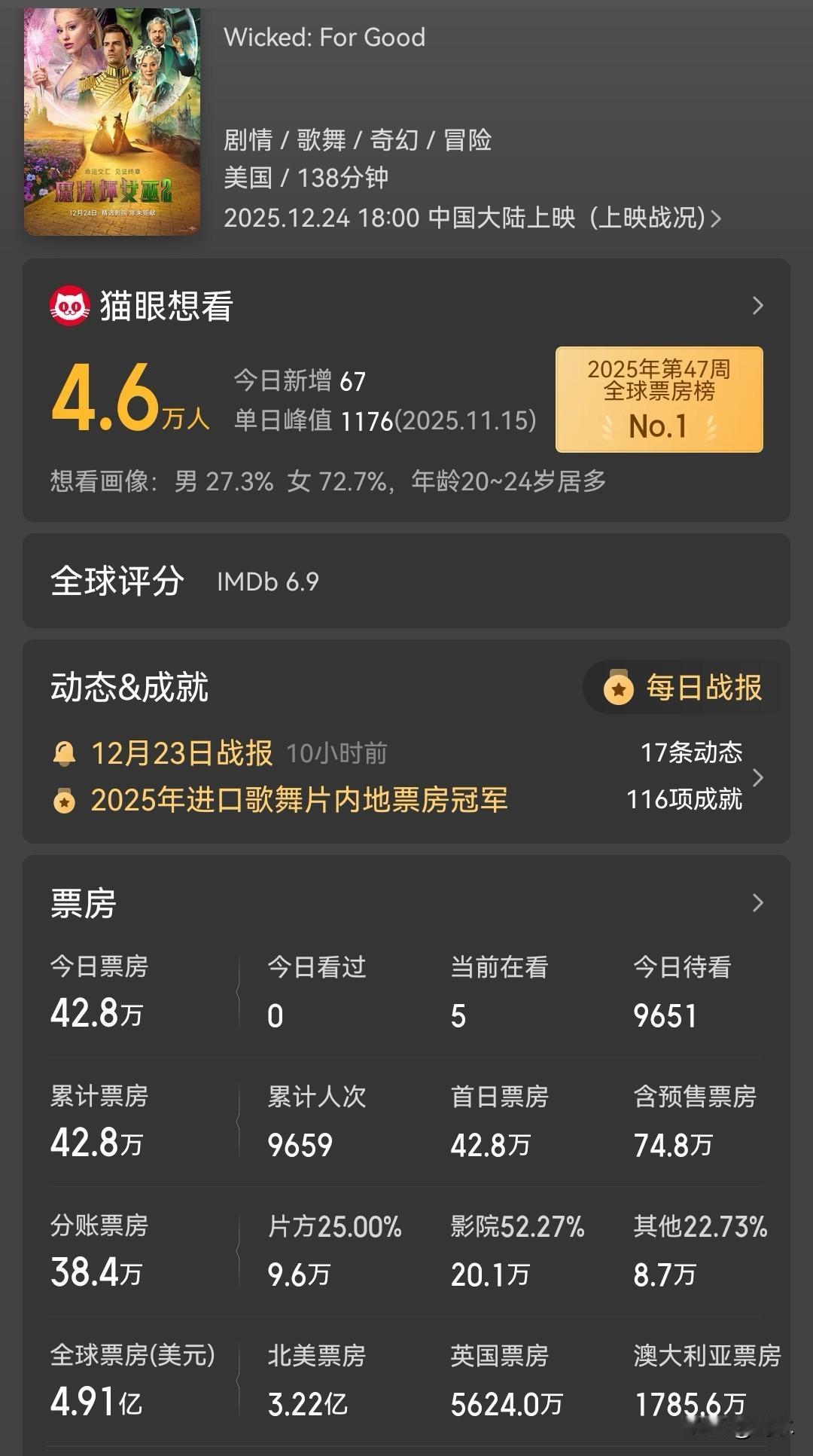 上映首日票房仅65万,好莱坞大片已经风光不在。 今天上映的好莱坞电影《魔法坏女巫2》,上映首日全国排片占比只有0.7%,全国拍映场次只有3000多,首日的实时票房只有65万,而该片在全球的票房则高达4.91亿美元。 为何好莱坞电影在中国内地电影市场不吃香了,即便是卡梅隆的超级大片《阿凡达3》在中国内地电影市场的票房也远远低于预期?那就是,中国内地电影市场已经不再迷信好莱坞电影。 即便是去年底上映的《魔法坏女巫》,在全球拿下了7.48亿美元的票房,北美市场就有3.91亿美元,可是,在中国内地电影市场却只有可怜的1532万人民币。 好莱坞电影的票房神话在中国内地电影市场已经被彻底打破,电影观众也不再迷信好莱坞电影,我们的电影从业者也不要迷信好莱坞电影。市场才是最终的审判官。 鸿水说