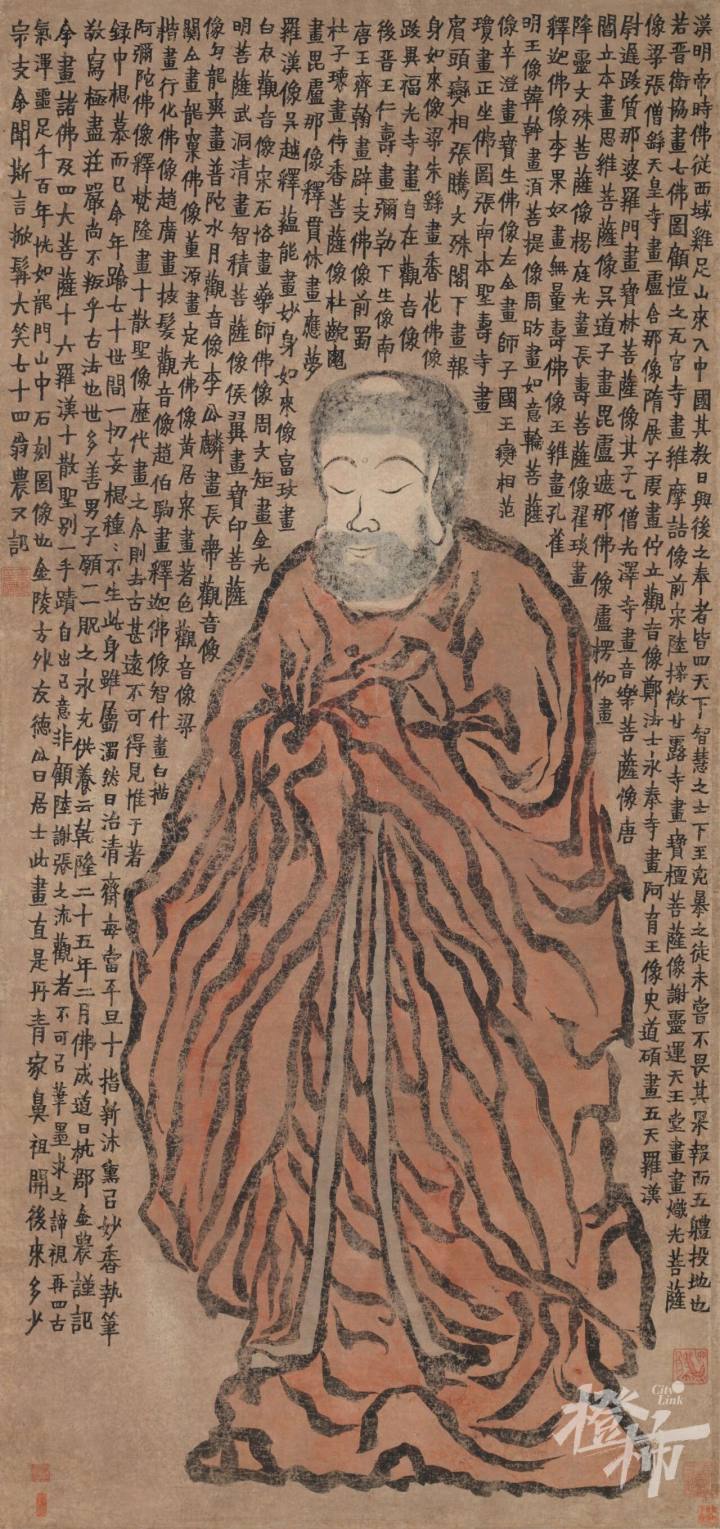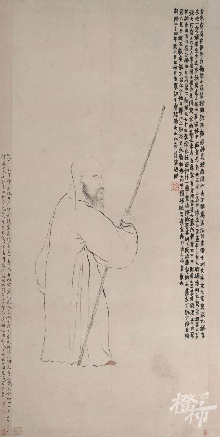 这幅自画像创作于金农73岁时,他自称是以水墨白描法写"三朝老民像"。画中的金农虬髯盈腮,脑后斜搭一撮小辫,脚踩红色鞋履,手持长杖,勾勒出奇倔傲世,清孤绝俗之风姿。据《冬心先生自写真题记》所载,金农一生共创作了九幅自画像,分别赠送丁敬,郑燮,罗聘及项均等人。