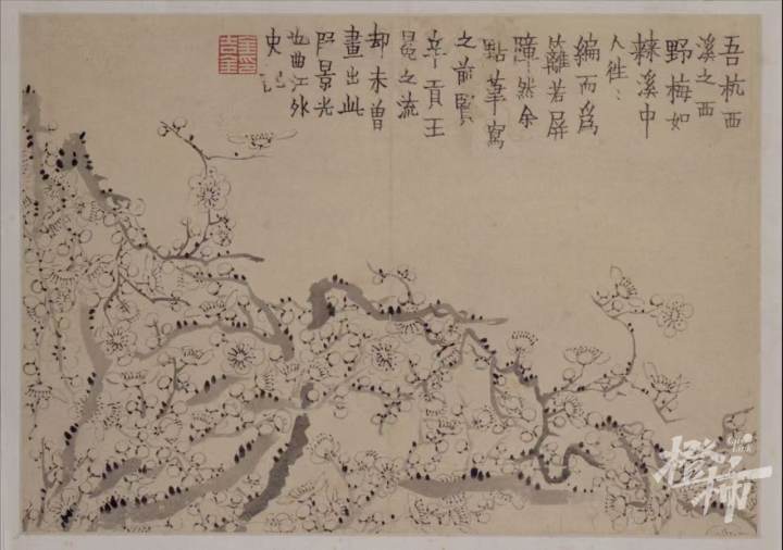 展厅里有许多金农画家乡杭州的景物,比如西溪野梅。金农素爱画梅花,他认为“画梅须有风格,风格宜瘦不在肥。”