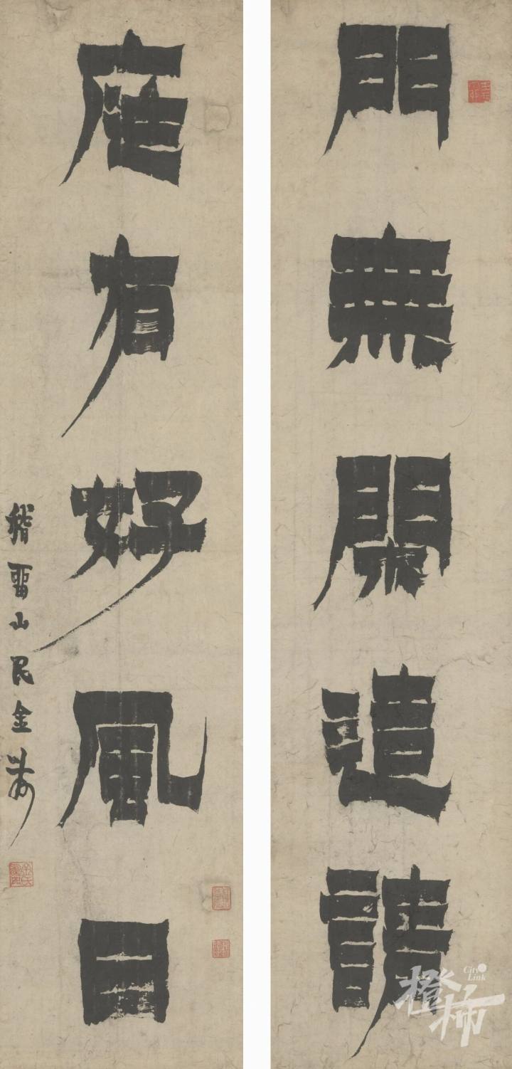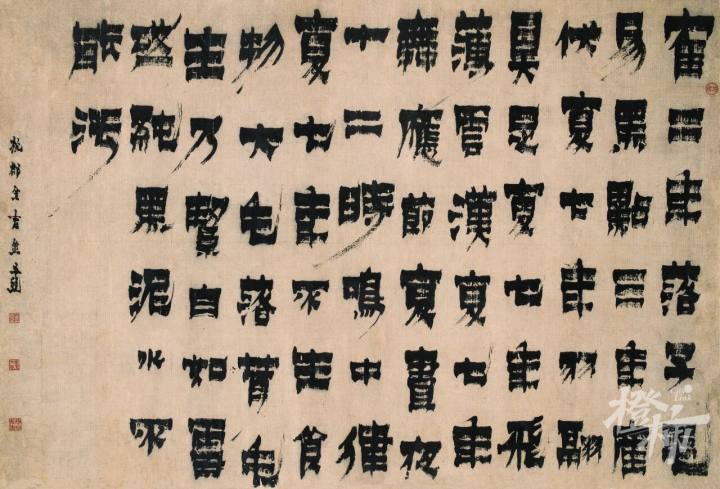 金农最早是以诗人的身份出道的,他的诗闻名江南士林,得到诗坛名宿毛奇龄、朱彝尊的赏识,师从著名学者何焯。后来开始专注于书法,清初金石学复兴,碑学初萌,改变了当时帖学垄断的单一书风。金农的书法以隶为基,溢为诸体,拙朴清峭。最具代表性的是他首创的“漆书”。这是用一种特殊的用笔用墨方法,很像用扁平的刷子刷漆一样,蘸上浓墨,行笔只折不转,自成一派,在清代乃至整个中国书法史上留下了令人瞩目的印记。