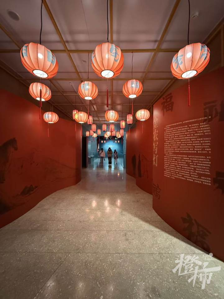 展览连廊空间挂满了红灯笼,看起来十分有年味,这也与金农有关。