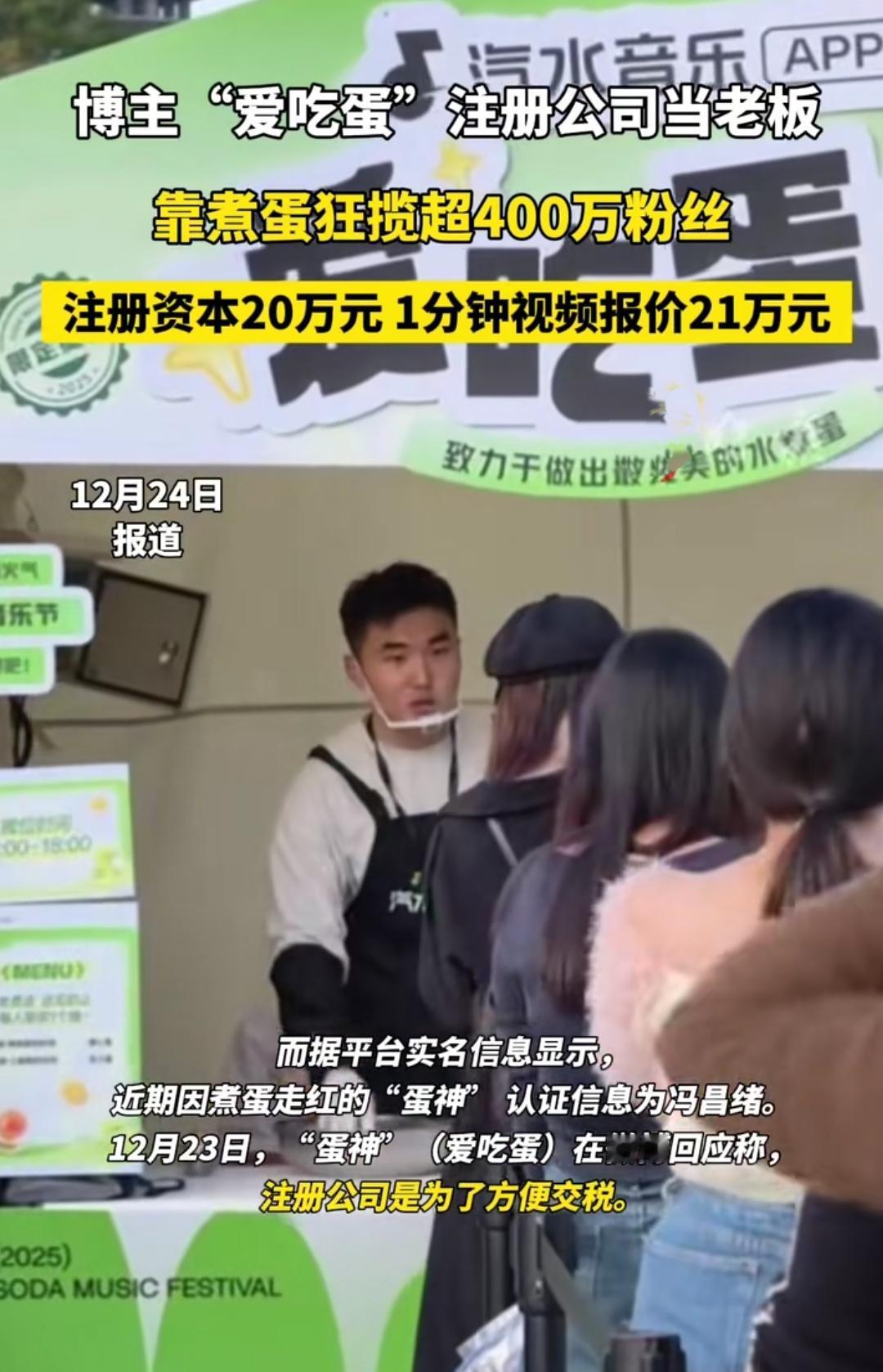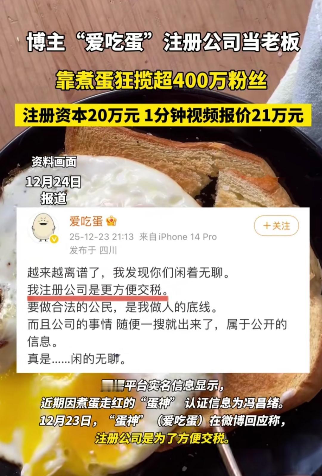 谁能想到,一个靠教煮蛋的博主,9天吸粉400万,1分钟视频报价飙到21万,刚注册20万的公司就被网友追着问,他直接回怼“你们闲着无聊”,说注册公司只是为了方便交税,做合法公民是底线。 这位叫冯昌绪的小伙,就是全网火出圈的“爱吃蛋”,靠着精准到秒的煮蛋教程爆火,还现身线下活动煮蛋,连专属的品牌展板都安排上了。可爆红的同时,质疑声也没停:有人觉得20万注册资本配21万的视频报价,商业化步子迈得太快;也有人好奇,把煮蛋做成“生意”,这份热度能留多久? 其实大家不是反感普通人靠本事赚钱,而是怕这份“把小事做到极致”的真诚,被过快的流量变现冲淡。他那句“合法交税”的回应很实在,但流量时代,光有底气不够,守住内容的初心才是关键。 你觉得他能把“煮蛋生意”做长久吗?评论区聊聊~