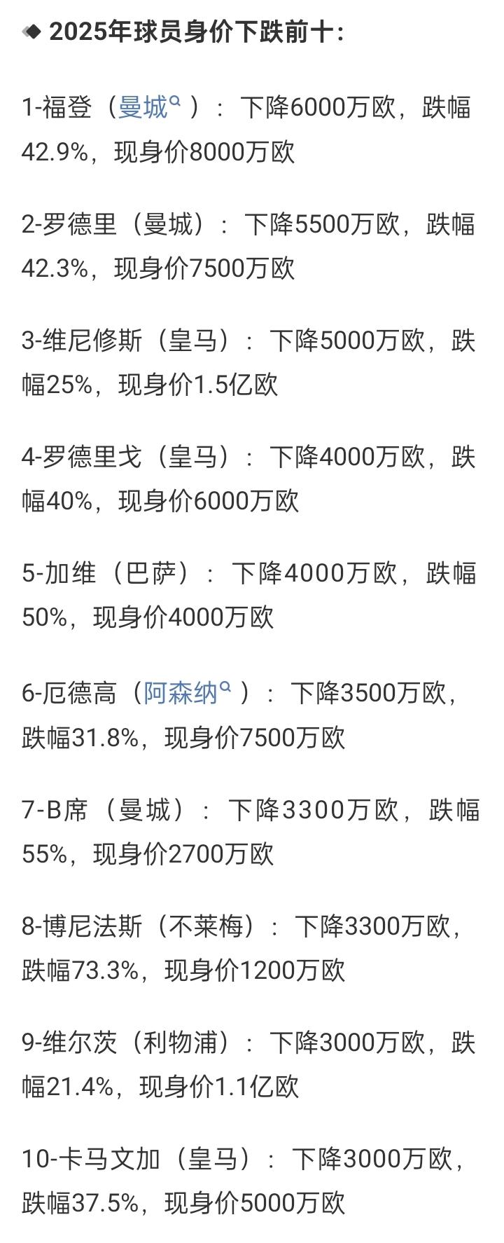 2025年球员身价跌幅:福登降6000万欧最多!罗德里、维尼修斯二三,罗德里戈、加维四五! 12月24日 德转今年五大联赛球员身价更新完毕,在跌幅榜中福登降6000万欧最多,罗德里降5500万欧,维尼修斯下降5000万欧。罗德里戈下降4000万欧,加维下降4000万欧,厄德高下降3500万欧