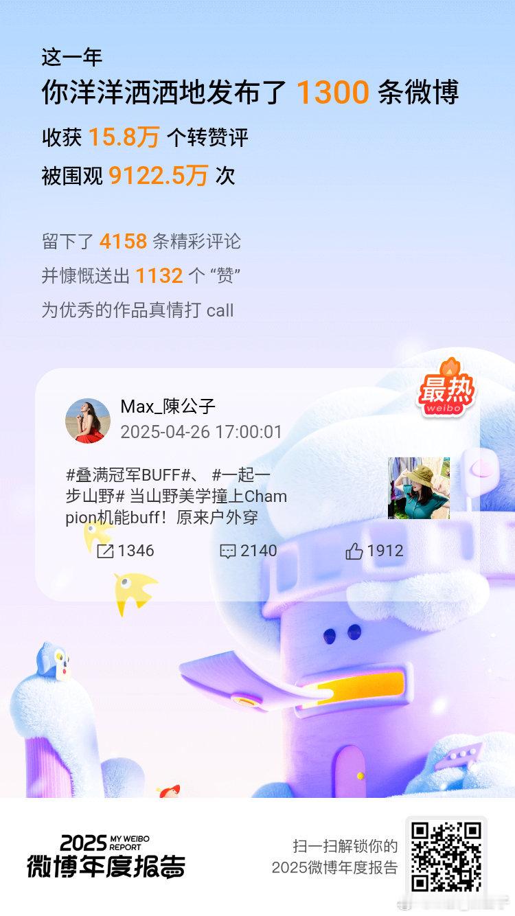 托你们的福,今年我保持金V成就30天 ,借你们的光,橙V保持了335天 !这份快乐也传递给你,速戳>>2025微博年度报告 ,解锁你的微博年度总结吧!微博年度报告微博之夜