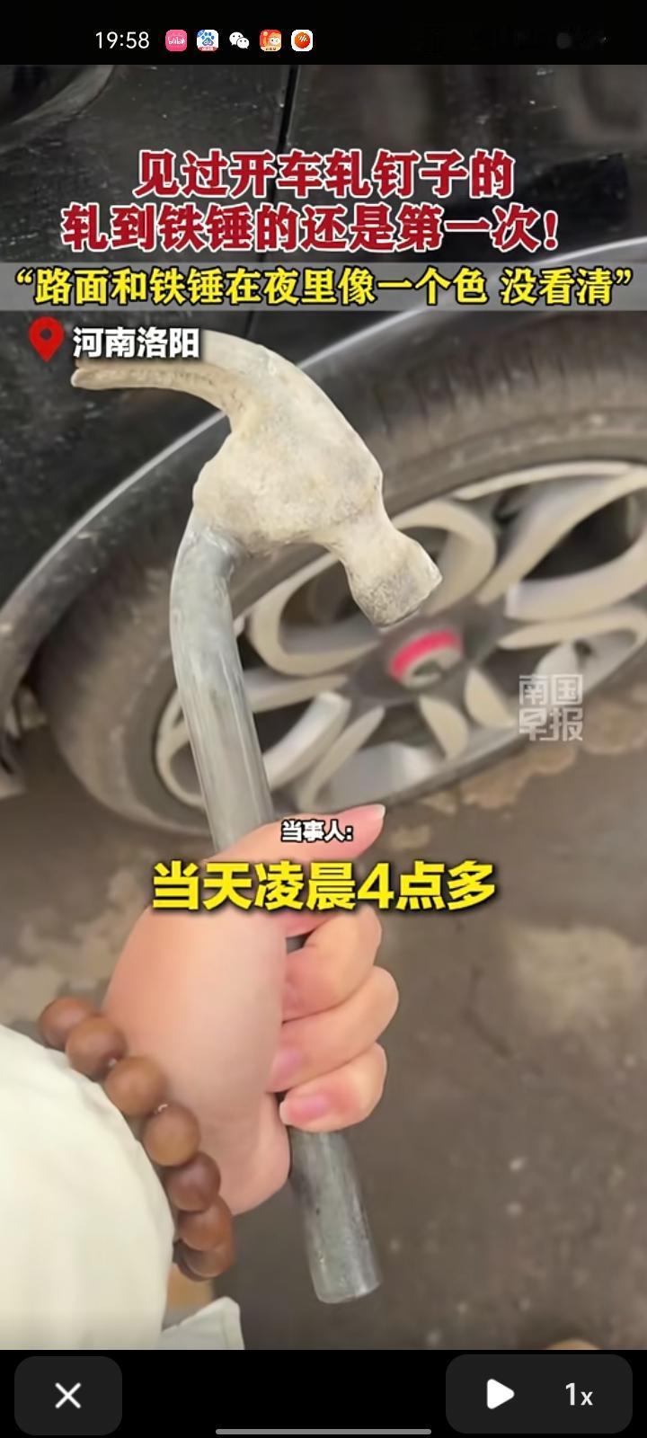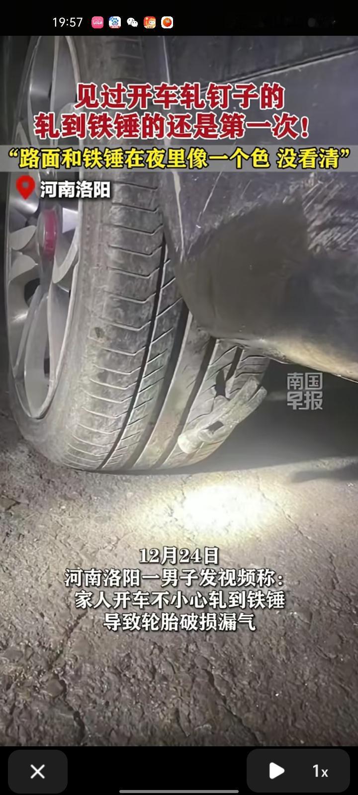 12月23日,河南洛阳。网友发视频称,家人开车不小心轧到铁锤,导致轮胎破损漏气,