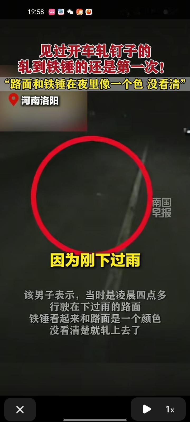 12月23日,河南洛阳。网友发视频称,家人开车不小心轧到铁锤,导致轮胎破损漏气,轮胎店及厂商也一脸懵圈。当时是凌晨四点多,行驶在下过雨的路面,铁锤看起来和路面是一个颜色,没看清楚就轧上去了。