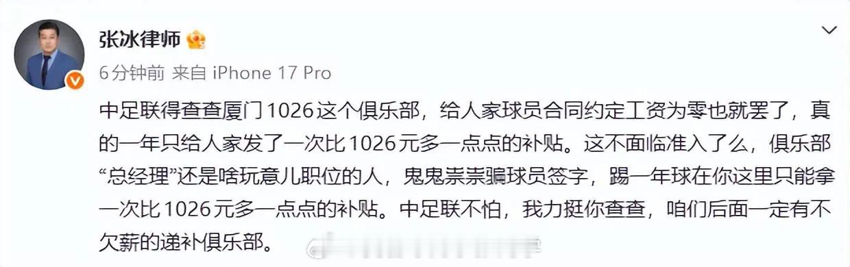 中国足坛又一奇闻:球员拿0工资,全年赚1千块!俱乐部已通过准入近日,中足联公布了第一批准入清欠俱乐部名单。但随后就有消息指出,有不少球员向中足联发起投诉,称准入名单上的部分俱乐部实际存在严重的财务问题。12月24日,中国足坛知名维权律师张冰,在个人社交平台爆料称,厦门壹零贰陆俱乐部不但和球员签订“0工资”合同,还以欺骗球员在薪资发放证明上签字。如果张冰爆料属实,该事件有可能成为年底中国足坛最大的笑话。张冰表示:“中足联得查查厦门1026这个俱乐部,给人家球员合同约定工资为零也就罢了,真的一年只给人家发了一次比1026元多一点点的补贴。这不面临准入了么,俱乐部总经理还是啥玩意儿职位的人,鬼鬼祟祟骗球员签字,踢一年球在你这里只能拿一次比1026元多一点点的补贴。中足联不怕,我力挺你查查,咱们后面一定有不欠薪的递补俱乐部。”按照张冰的说法,如果厦门壹零贰陆真的与球员签订约定工资为0的合同,那么整个事件就不仅仅是“荒唐”的程度了,还是涉嫌严重的违法。尽管中国足协、中足联迟迟没有规定中国各级别联赛球员的最低工资标准,但是按照相关法律规定,只要是劳动付出,就应该获得报酬,“0工资”合同在法律上完全站不住脚。因此,如果真有球员发起投诉,那么厦门壹零贰陆肯定要面临很大的风险。至于张冰所说厦门俱乐部一年只发了1026元补贴、以及为了通过准入而欺骗球员签字,这种事情在中国足坛其实已经不新鲜了,只不过是中国低级别联赛球员生存困境的又一次写照。厦门壹零贰陆成立于2019年。今年中冠联赛,该队夺得冠军,锁定了下赛季中乙参赛资格。此前中足联公布的第一批完成准入清欠名单中,厦门壹零贰陆名列其中。