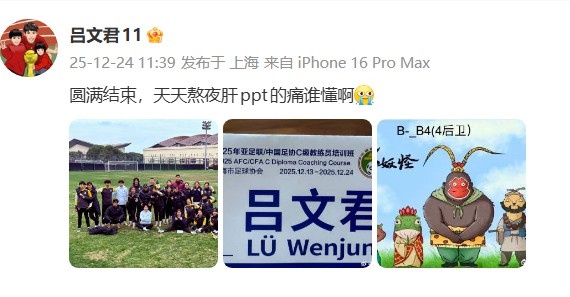 直播吧12月24日讯今日海港前锋吕文君更新社媒,分享2025年亚足联/中国足协C级教练员培训班合照。
