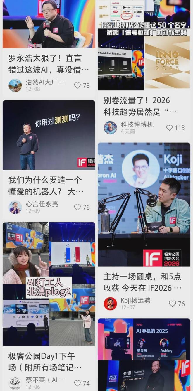 比如今年我自己的小红书信息流里,就刷到了上百篇参会者发认真分享的IF大会的笔记。他们自己的视角和观点,他们的眼睛里看到的大会里那些具体的收获,是「原生」的、没有修饰的分享,它是如此的「真实而具体」,它能让你看到极客公园团队努力创造的东西,也真的有「真实而具体」的意义。