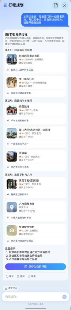 华为手机用户一定要下载华为自带的花瓣地图,因为在花瓣地图的“行程规划”里可以根据自己的想法,通过AI规划出行程与推荐,让一个打算去往陌生城市的游客有了重要行程参考。 我自己平时出差、旅游都爱用地图软件,最近用华为手机的朋友跟我安利花瓣地图,特意试了试这个AI行程规划功能——真挺惊艳的。比如我打算去西安玩三天,输入“喜欢吃小吃、看古建筑、不想走太多路”,花瓣地图立刻给我规划了回民街+钟楼+陕西历史博物馆的路线,连午饭点、休息区都标得清楚,比我自己查攻略省了两小时。 对比了下常用的百度和高德,确实还没这个“定制化”功能。现在自由行的人越来越多,大家需求各不相同:有人爱打卡网红点,有人想深度逛老街,有人带老人孩子得考虑体力……花瓣地图的AI能“读”懂这些小心思,相当于随身带了个私人导游,这细节做得太到位了。 华为这些年在软件生态上真是下功夫,从鸿蒙系统到各种自研应用,都在想办法解决用户实际需求。作为用了好几年华为手机的老用户,看到自家品牌的软件越做越智能,挺自豪的。还没用过花瓣地图的华为用户,真可以试试这个行程规划功能,说不定能打开旅行新体验呢! MCN双量进阶计划