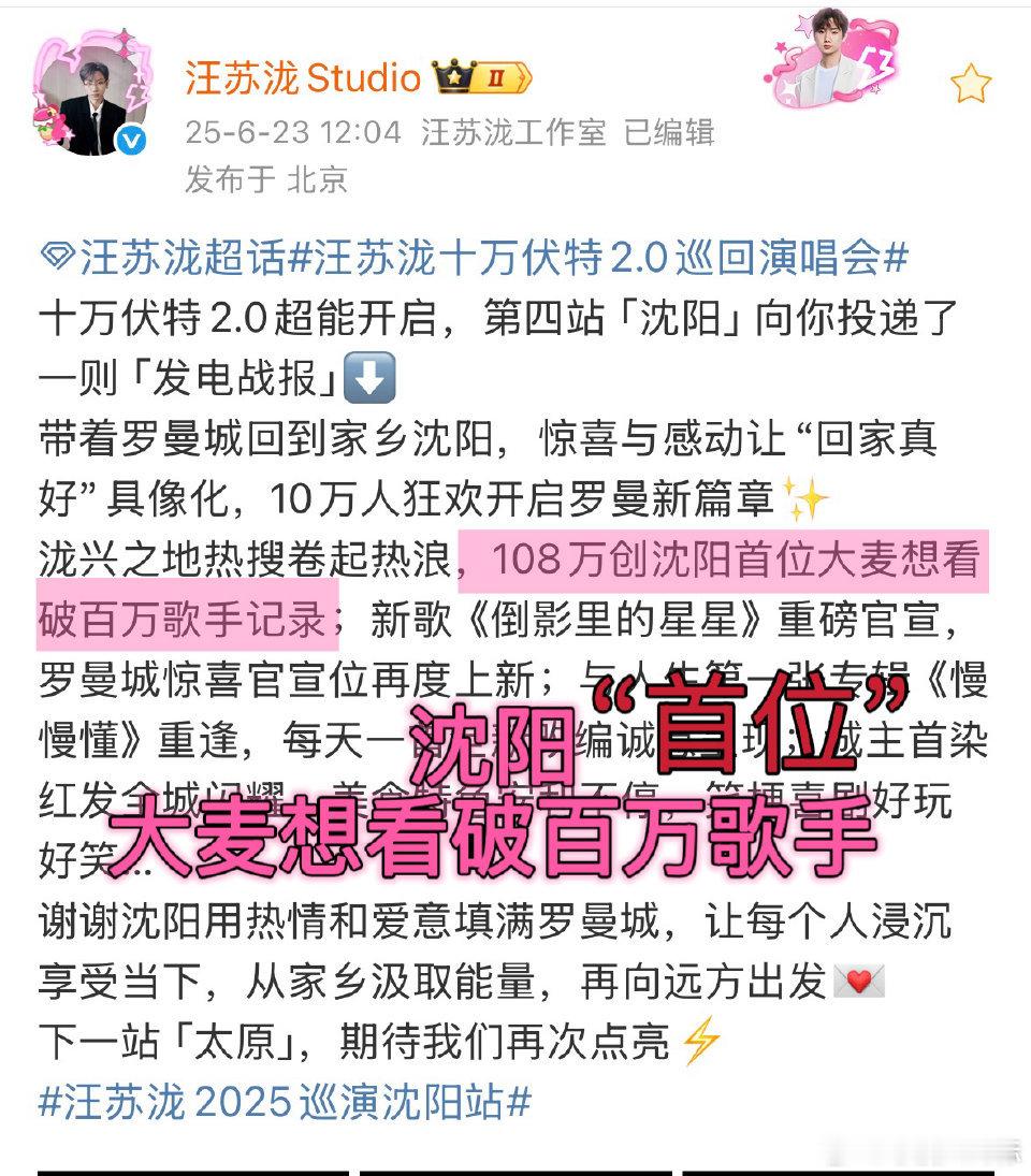 汪苏泷首字含金量还在上升汪苏泷“首”字的含金量,在2025年持续飙升!他是首位首次世巡就实现新加坡三连开的内地歌手,也是内地史上首位登陆墨尔本万人馆并两连开的艺人;打造全球首部XR演唱会互动电影、中文世界首部演唱会设定集,还拿下皮克斯电影首支原创定制中文片尾曲。从沈阳首位大麦想看破百万歌手,到鸟巢首个3+4面台创举,再成上海杜莎首位年度音乐官,每一个“首”字,都是他用实力书写的音乐新章,浪漫与突破永远在线。