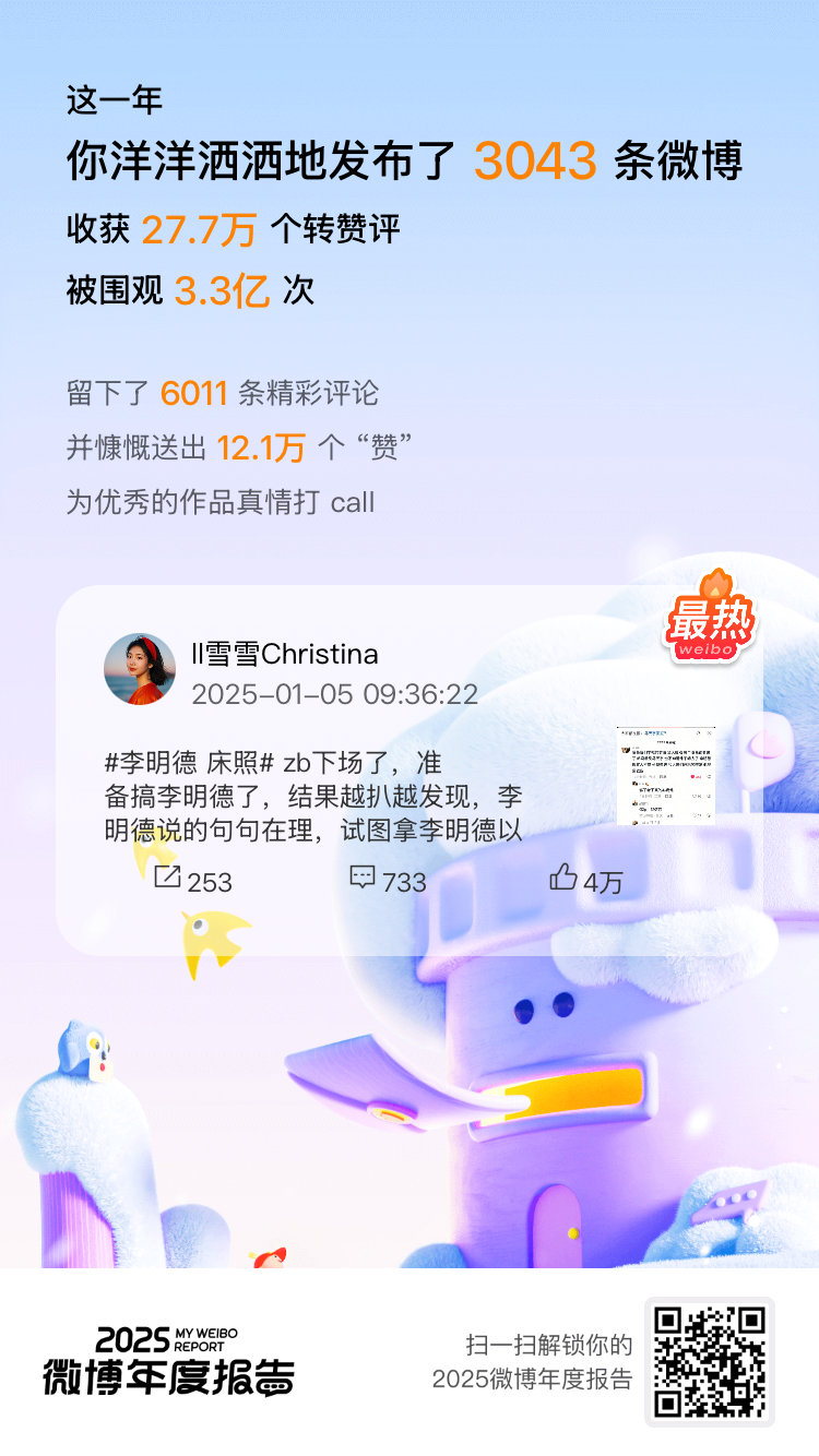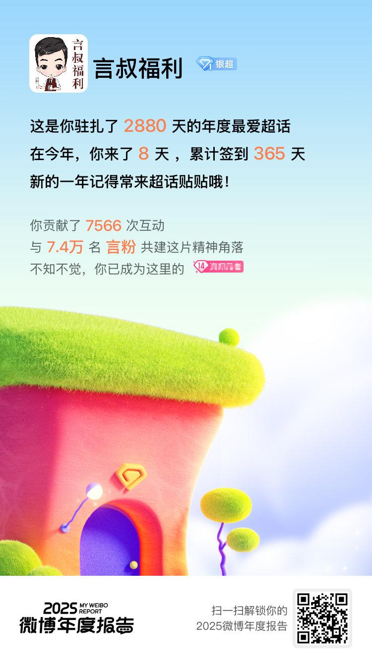 微博年度报告 实力这一块,咱确实拿捏了!2025年稳稳保持 金V身份9天,橙V身份326天!相逢的意义在于彼此照亮,这份成绩单离不开你们一直以来的支持和陪伴!你的专属年度播报也已生成,速来>>2025微博年度报告 围观!微博之夜