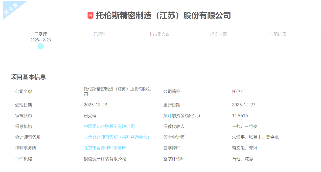 上证报中国证券网讯(记者郑维汉)12月23日,深交所官网显示,托伦斯精密制造(江苏)股份有限公司(简称“托伦斯”)创业板IPO获受理,中金公司为保荐机构。