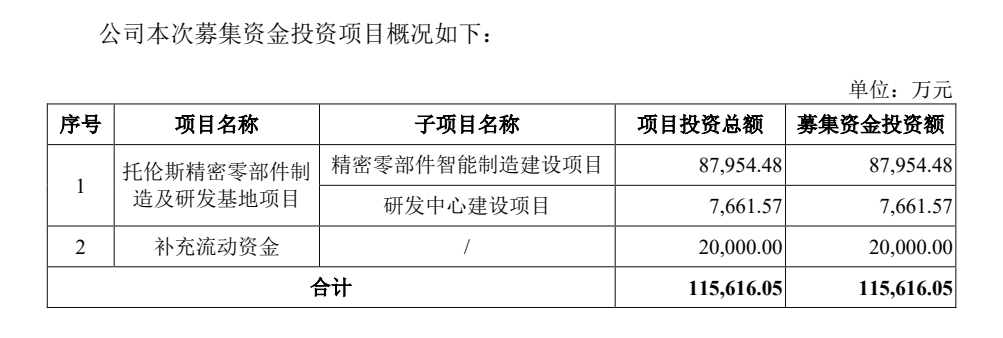 托伦斯本次发行上市拟募集资金11.56亿元,将投资于托伦斯精密零部件制造及研发基地项目及补充流动资金。托伦斯称,公司现有产能已基本饱和,通过本次上市,公司募集资金投资于先进的生产设施、技术和人力资源,从而提高生产效率,突破产能瓶颈,进一步提升公司业绩水平。