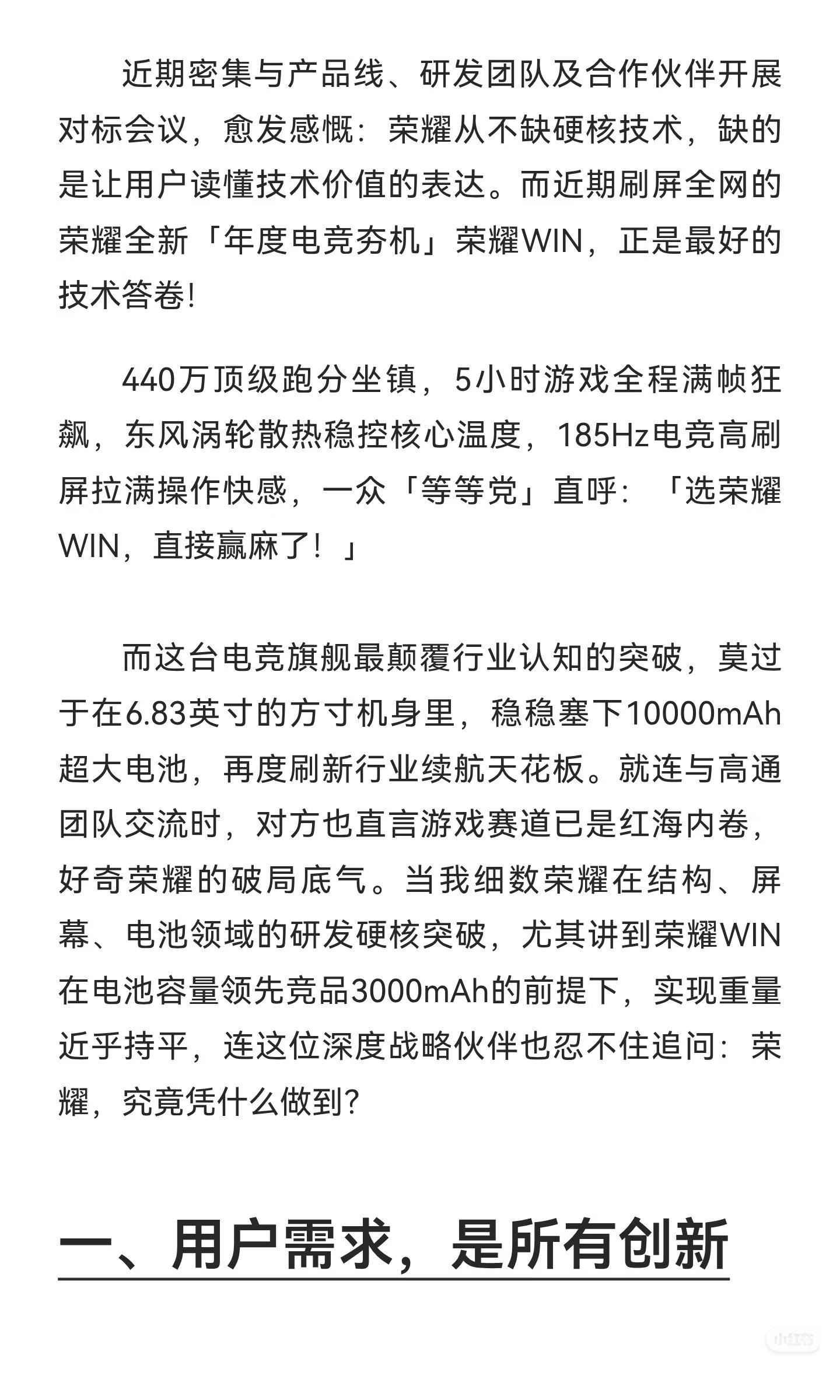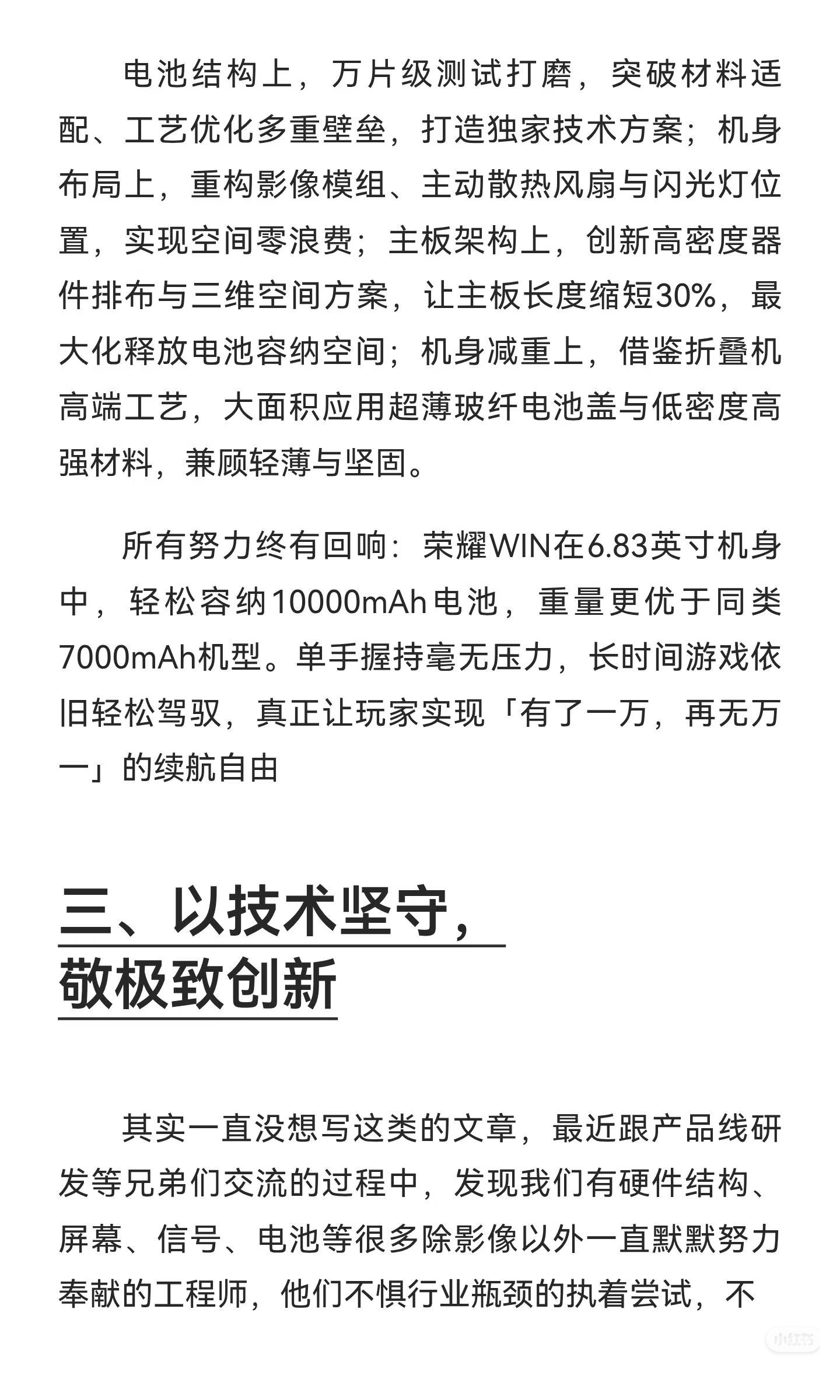 荣耀WIN电池做到一万毫安时的背后是荣耀的研发工程师面对用户需求的永不止步,研发