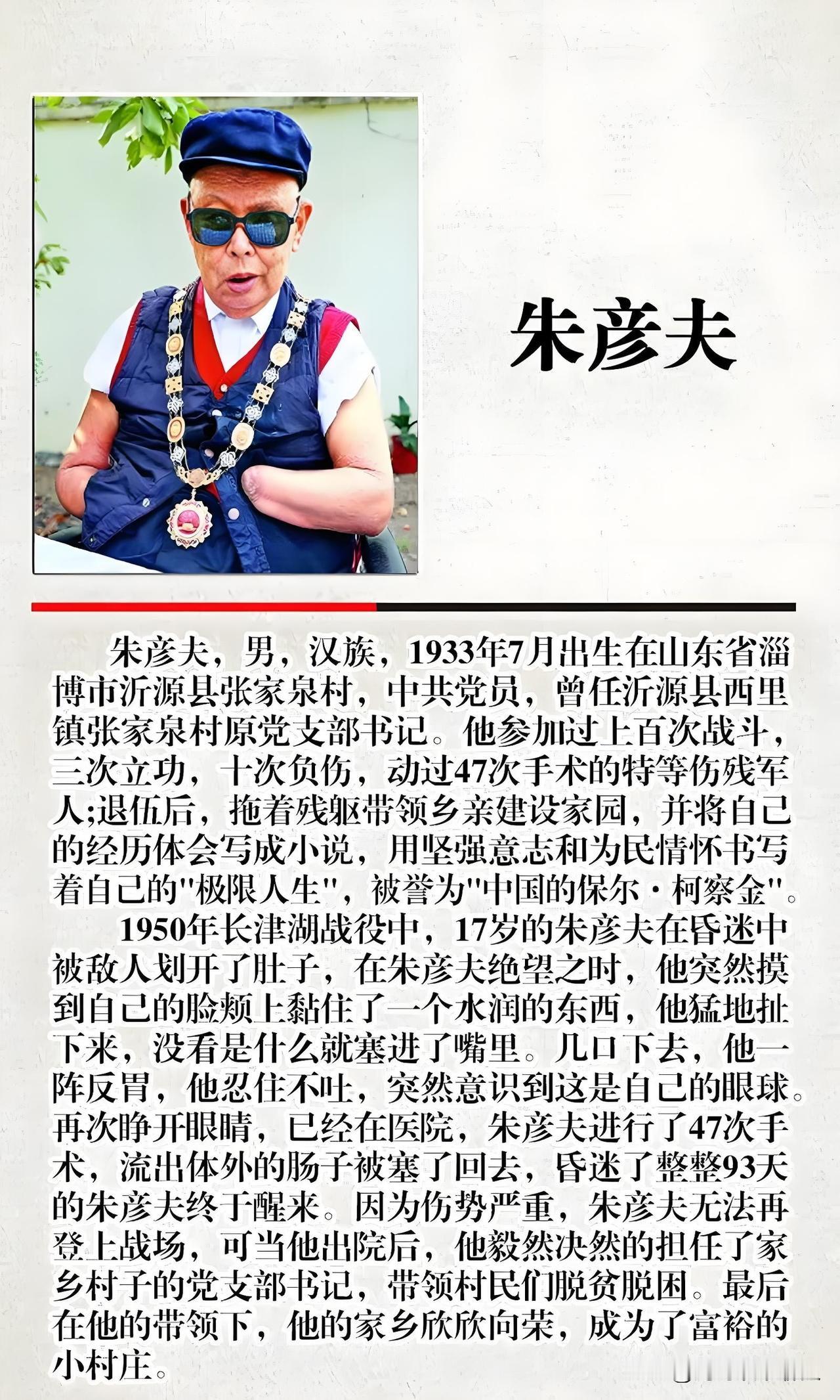 零下40度,17岁少年被美军划开肚子。他摸到外翻的肠子,竟把滑到嘴边的左眼吞了下去——而这只是他300天重生路的开始。 1950年长津湖,250高地的雪被血浸透又冻硬。朱彦夫在战友遗体间醒来,发现左眼挂在脸上。极寒麻痹了疼痛,却让血腥味格外清晰。他吞下眼球,把冻僵的肠子塞回腹腔,用棉衣碎布捆紧伤口。 雪地里开始蠕动。截肢的双腿在身后拖出血痕,右臂残端杵进冰层借力,一寸,又一寸。他爬过握着枪的冰雕战友,爬过炸碎的铁锹柄,爬了三天两夜。直到听见中文呼喊,才放任自己陷入黑暗。 93天昏迷,47次手术。醒来时他先看见空荡荡的袖管,接着发现裤管也瘪着。护士按住他挣动的肩膀:“全连就剩你了。”他愣住,想起指导员临终攥着他的手:“把咱们连的故事……传下去。” 这句话成了他的脊梁。 拒绝疗养院,他回到沂源县山村。关起门练习用嘴切菜,饭菜撒了就用舌头舔。假肢磨破嫩肉,化脓流血,布条缠了一层又一层。第一次站立时摔碎茶缸,第二次撞翻木凳,第七天他走到院门口,阳光照在满是汗水的脸上。 村民选他当支书时,他正用残臂夹着拐杖测荒坡。17斤假肢踩进乱石堆,残端磨出白骨。他带人扛炸药上山,用牙咬导火索,炸开第一块岩石。修水渠那年冬天,他摔进冰窟窿,假肢灌满泥水,被人拖上来时嘴唇发紫:“继续干。” 25年,荒山长出80亩梯田,电线杆立到村口。他主持分红大会,账本用断臂按着,算盘珠子由会计代拨。村民叫他“肉轱辘书记”,他笑:“总比冰雕强。” 60岁生日那天,他摊开稿纸。笔绑在断臂上写不出字,改用牙咬。墨水吃进嘴里,稿纸被口水浸透。写战友名字时他停顿很久,仿佛那些年轻面容就在纸页间。 第七年春天,33万字《极限人生》完稿。他在山头烧了第一本手稿,风把灰烬卷向天空。“指导员,任务完成了。”假肢深陷泥土,像当年在长津湖的雪地里扎根。 今年清明,94岁的他坐在荣军院窗前。有人问后悔吗,他转动仅剩的右眼:“我替48个人看新中国,值了。”窗外桃花开得正盛,那是他家乡嫁接的新品种。 脊梁不是骨头,是风雪压不垮的念想。他活成了纪念碑,字字带血,步步生花。 这样的生命,让你想起了谁?评论区留下你心中“最硬的脊梁”。