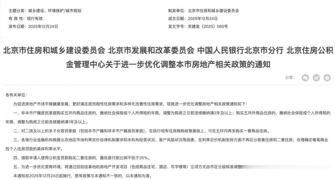 12月24日,北京市住房城乡建设委、市发展改革委、人民银行北京市分行、北京住房公积金管理中心等4部门联合印发《关于进一步优化调整本市房地产相关政策的通知》(下称《通知》)。