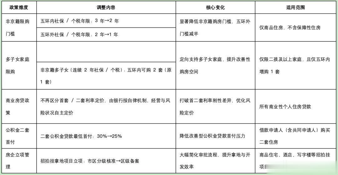 该《通知》明确,为更好满足居民刚性住房需求和多样化改善性住房需求,进一步优化调整住房限购政策,比如放宽对“非京籍新市民”与“多子女改善家庭”的限购、金融端利率与首付双减。