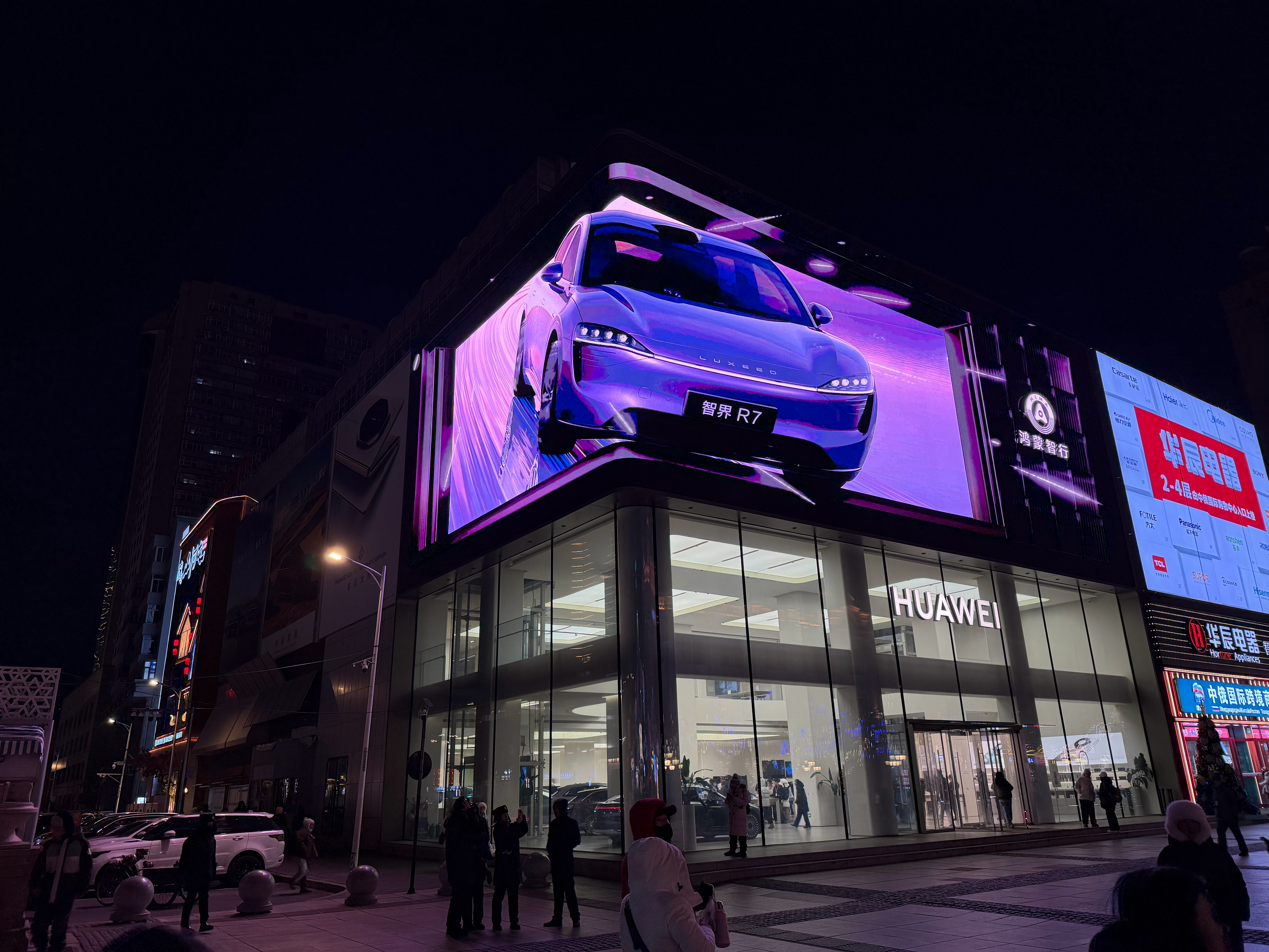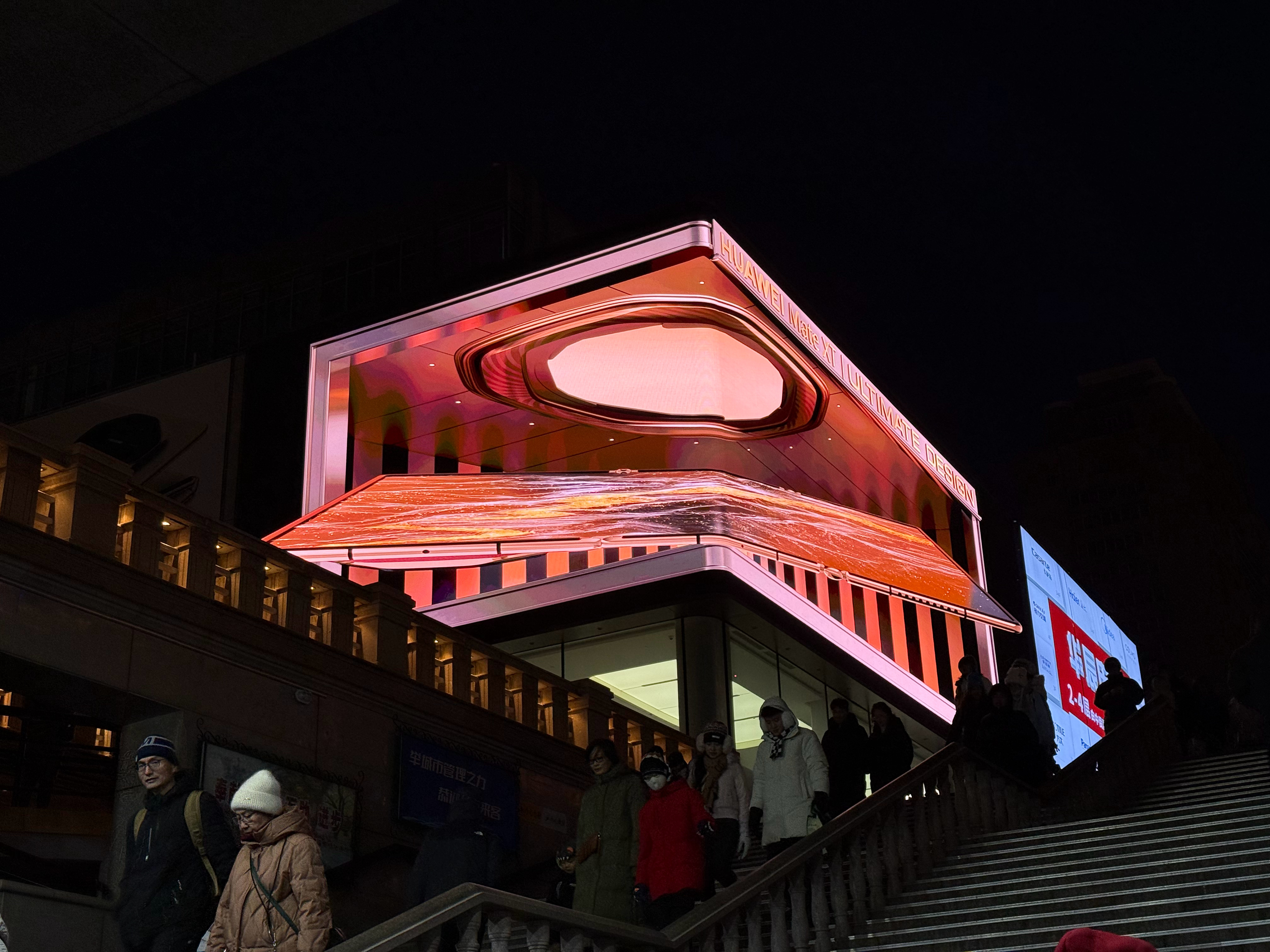 两年没来哈尔滨了,这个中央大街这华为门店上面是一个巨大的 3D 裸眼大屏,现场观