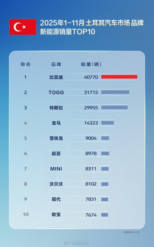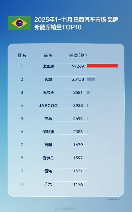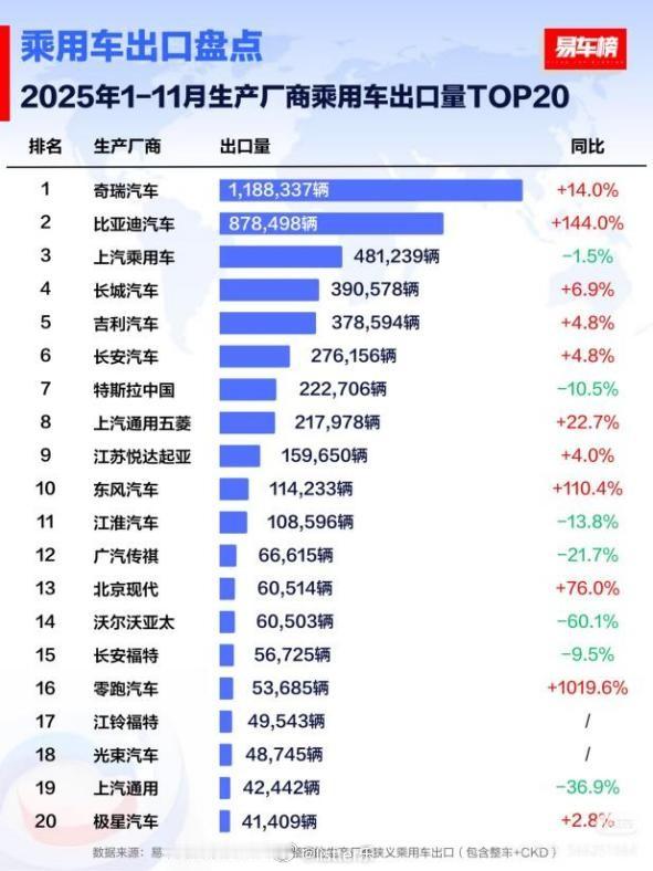 据易车数据显示,2025年11月,比亚迪乘用车出口量达到12.8万台,同比增长313.4%;今年1-11月累计出口87.8万台,同比增长144%,较2024全年总出口量已实现翻倍式增长,比亚迪成为中国出口增速最快的车企之一。11月,比亚迪在巴西、土耳其、意大利、西班牙、匈牙利、克罗地亚等国拿下了新能源汽车销量第一,在新加坡等国家获得全品牌销冠。多国销冠全面超越,1-11月累计表现同样不俗,在巴西、土耳其、西班牙、意大利等国,比亚迪位列新能源汽车品牌销量榜首;在新加坡、中国香港等地区市场荣膺全品牌销量第一,备受消费者认可。