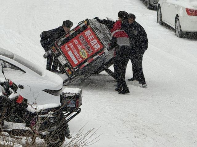 23日10时,香坊分局军民派出所民警曹喜东、岳轩仡带领辅警郝金午巡逻时发现路边侧翻的快递车,快递小哥蹲在雪地里焦急地直搓手。“师傅别着急,我们来帮你!”先把散落的快递一个个搬到安全地带,再合力扶起沉重的车身。雪花落在他们的警服上,这一幕,成了雪天里最美的风景。
