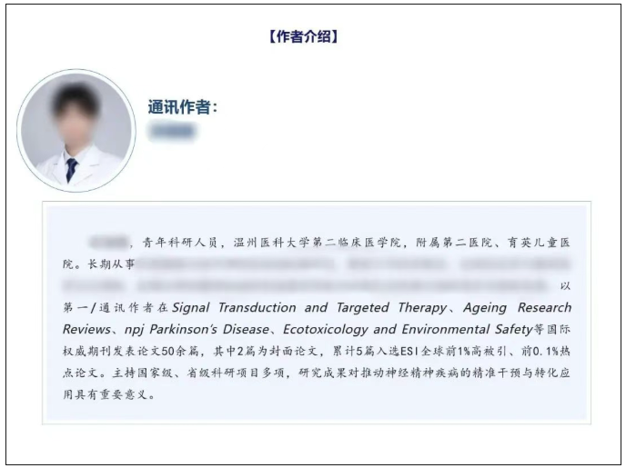 记者注意到,12月5日,有期刊账号发布的一篇论文中,作者介绍显示为该本科生。“作者介绍”显示,该生系青年科研人员,来自温州医科大学第二临床医学院,附属第二医院、育英儿童医院。他以第一/通讯作者在多个国际权威期刊发表论文50余篇,其中2篇为封面论文,累计5篇入选ESI全球前1%高被引、前0.1%热点论文。主持国家级、省级科研项目多项。