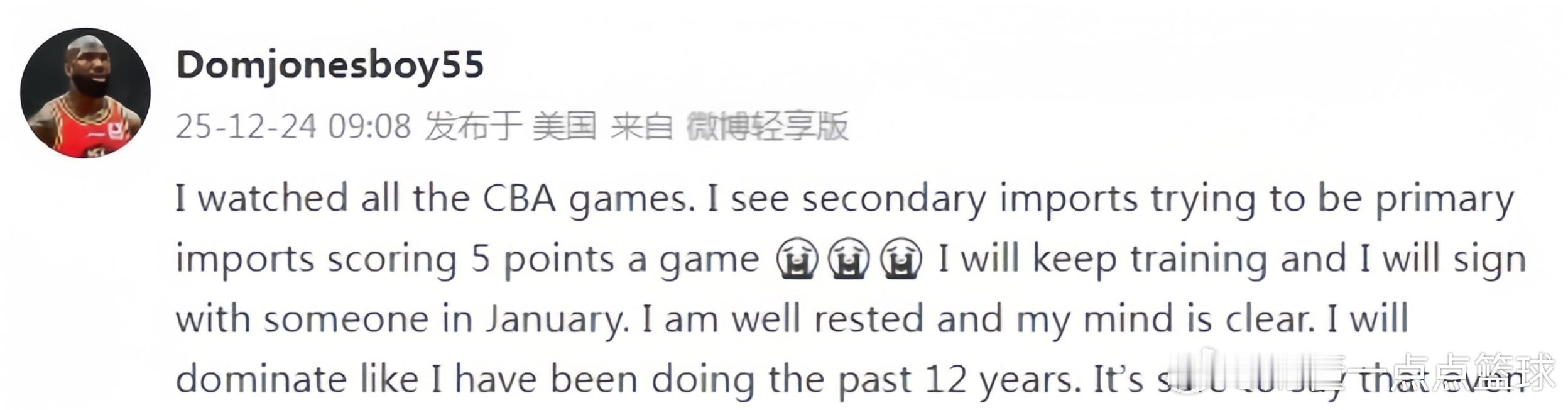 前吉林男篮外援琼斯社媒喊话了,希望有球队在明年的一月份把他给签约了,他对自己的状态是信心满满的。还嘲笑某位单场只拿到5分的外援。话说,这位单场比赛只拿到5分的外援说的是谁?琼斯原话如下:“我看了所有的CBA比赛。那些试图扮演核心外援的低水平外援单场只得5分,[笑哭][笑哭][笑哭]我会保持训练,一月份就会和某支球队签约。我现在身心状态俱佳,头脑清晰,我会像过去12年那样继续统治比赛。即便是在当前,我依旧是CBA前三的外援!”不知道各位球迷还记得这位光头外援吗?