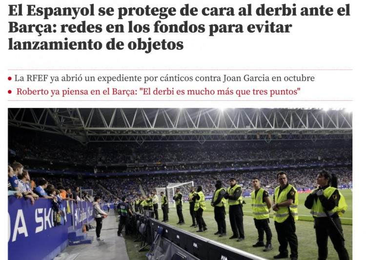 考虑到目前球队排名西甲第五、距离欧冠区仅一步之遥的大好形势,俱乐部不希望因球迷骚乱而遭受处罚。为此,西班牙人决定在主场球门后方的看台加装防护网,以防止球迷向场内投掷杂物。