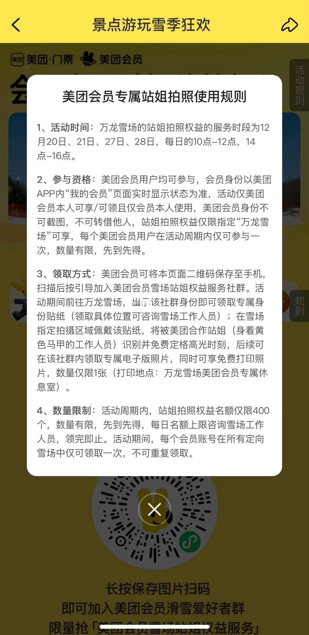 滑雪出片照 这个冬天不用再为滑雪出片发愁,万龙滑雪场上线美团会员专属福利,免费站姐约拍服务直接安排,专业拍摄加精修一站式搞定。黑钻黑金会员还能解锁专属休息室,暖饮零食相伴,选片都变得惬意,打开美团就能预约,轻松定格超飒滑雪瞬间。