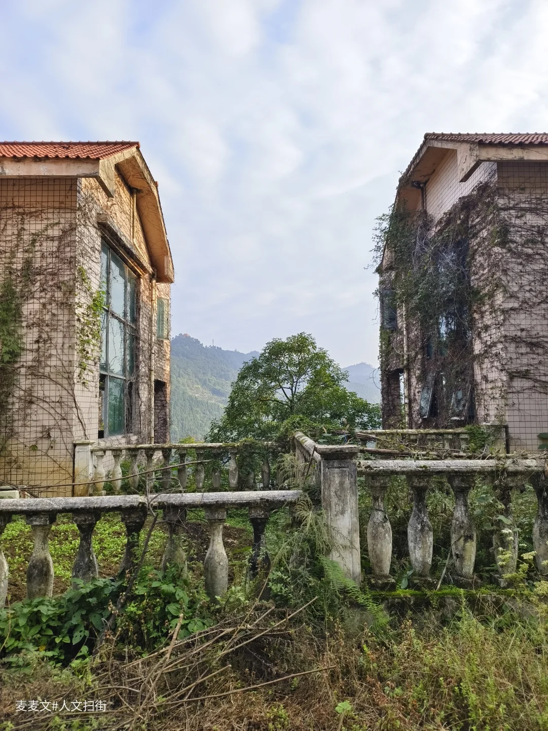 桃都山庄,坐落于重庆市巴南区南温泉大山之中。1997年前后建成的两三层欧式别墅群错落分布。拱形门窗、雕花栏杆配着开阔露台,甚至藏着苏州园林的复刻元素,每一处设计都透着当年对现代生活的热烈憧憬。