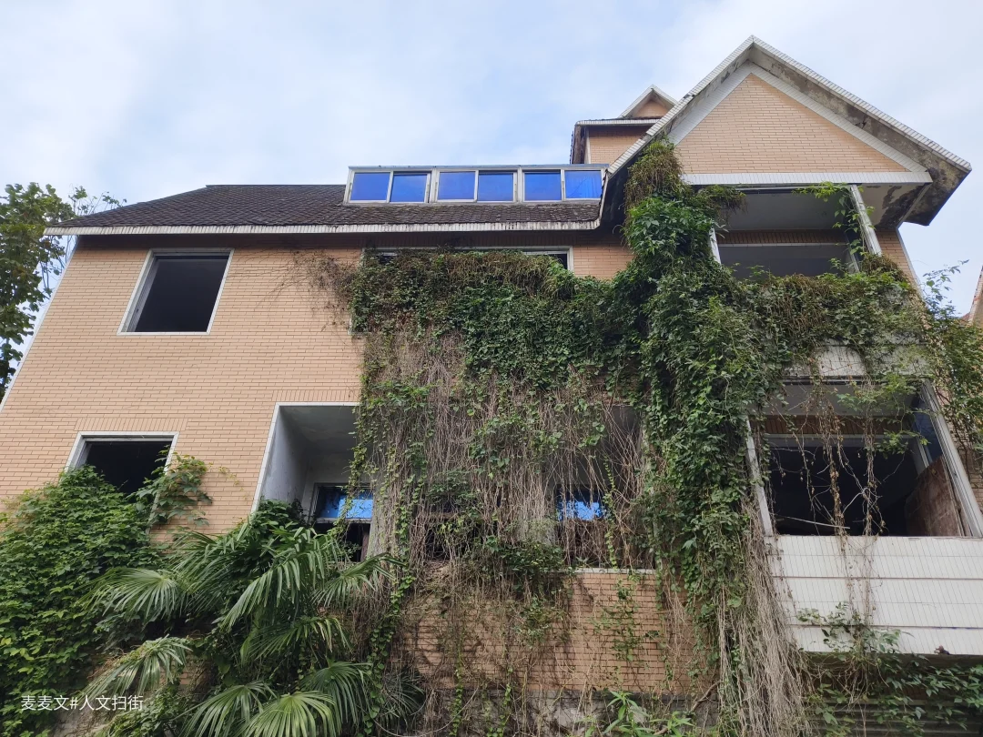 可2009年人类退场后,自然便悄悄接过了这片领地。藤蔓从地基裂缝攀援而上,裹住原本雪白的墙面。野草顶破地砖缝隙,把庭院织成荒芜绿毯。最让人唏嘘的是那些生活痕迹的溃败,欧式栏杆围合的堂前,枯枝败叶早已嚣张地占满每个角落。