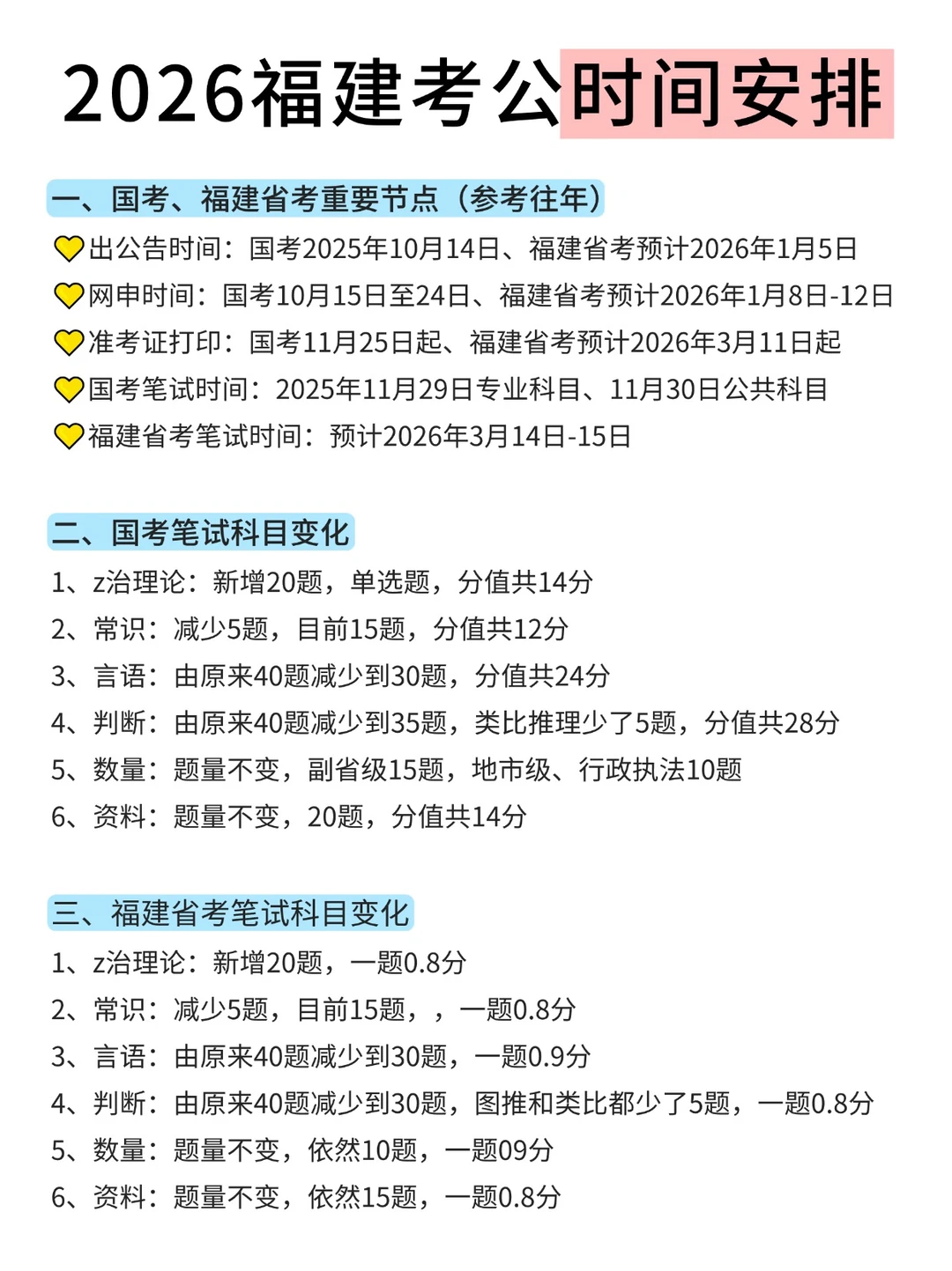 1、出公告时间:国考2025年10月14日、福建省考预计2026年1月5日