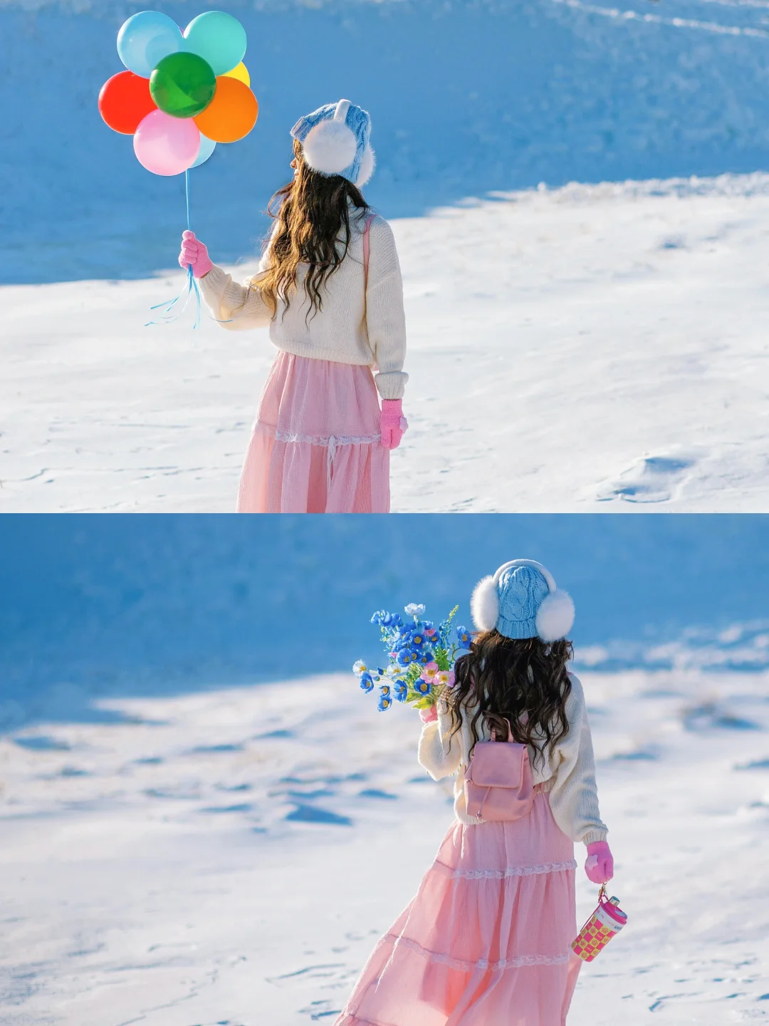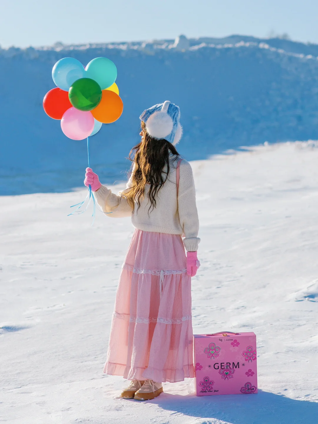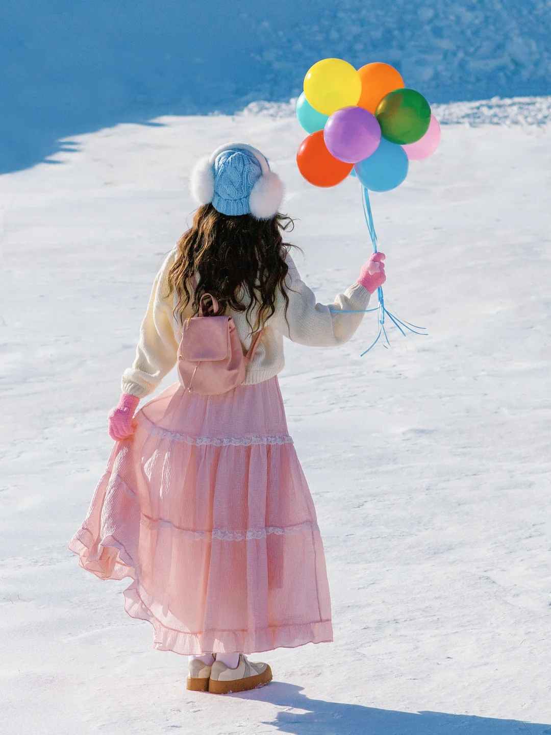 纯净的雪地搭配上彩色气球,太好拍啦~