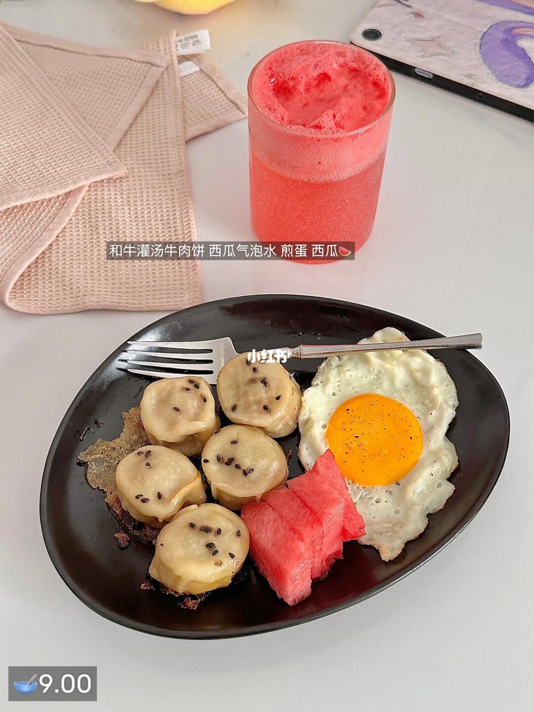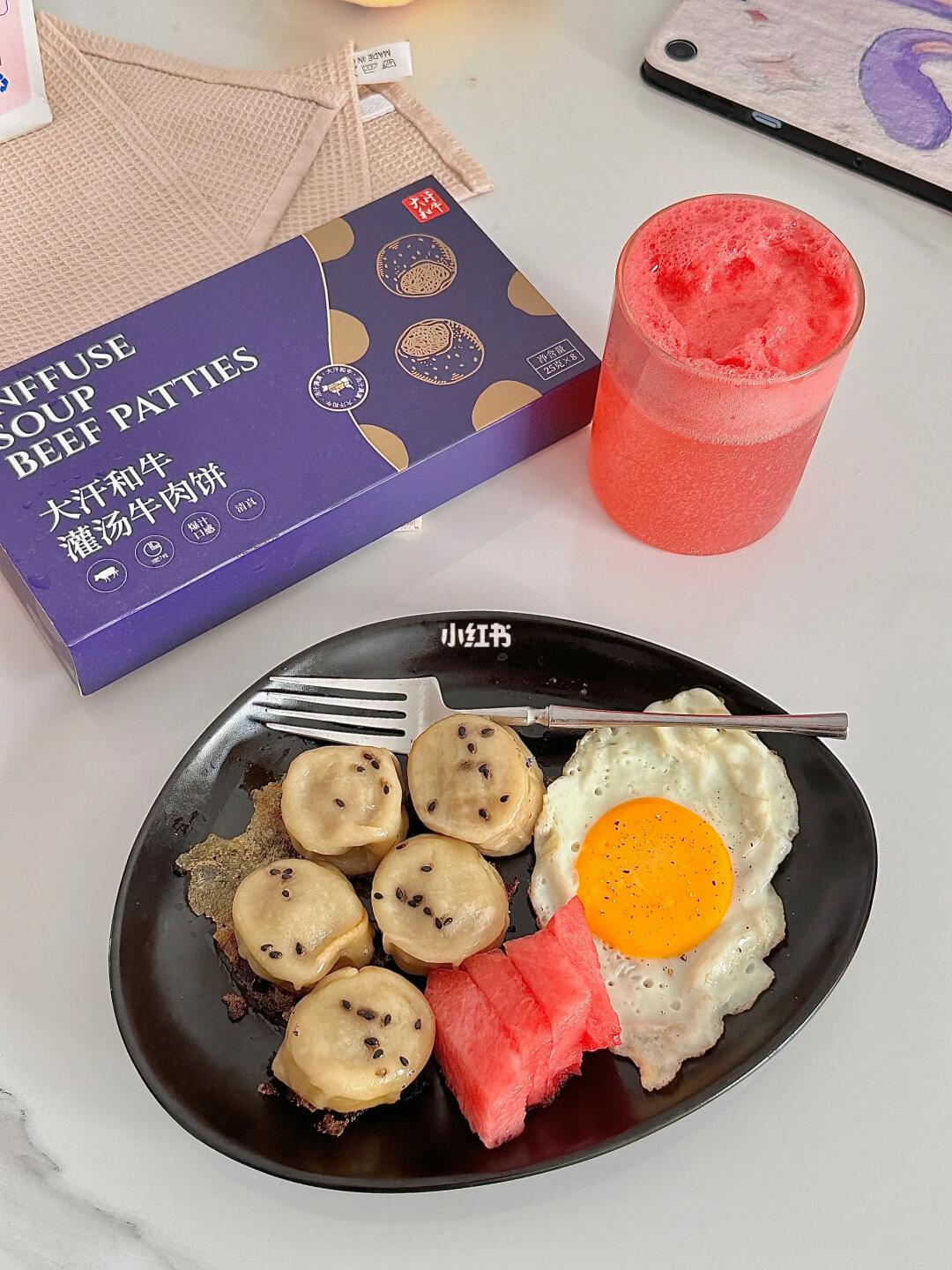 初始体重:60kg 目标:40kg - 🥣早餐:和牛灌汤饼➕煎蛋➕西瓜汁➕🍉 🥣午餐:鸡翅 🥣晚餐:土豆炒豆角➕疙瘩鸡蛋汤 运动🈚 喝水2000ml - ●减肥人每天最期待的就是早餐啦,今天吃和牛灌汤饼 薄皮里锁着满满的牛肉馅和汤汁 一口爆汁 巨满足,配料表干净 蒸煎烤吃都可以 ,你就吃吧,一吃一个不吱声!