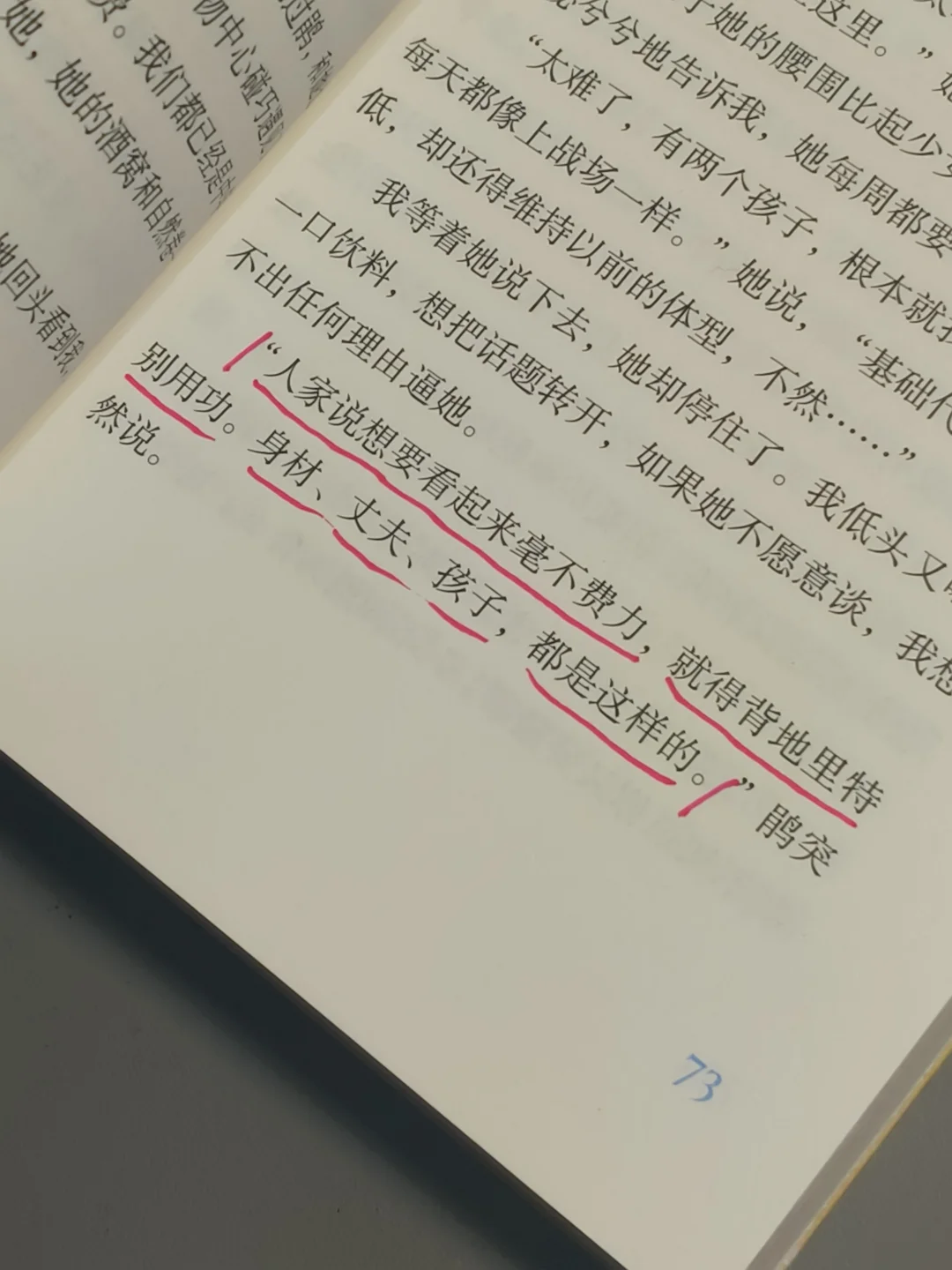 “人家说想要看起来毫不费力,就得背地里特别用功。身材、丈夫、孩子,都是这样的。”