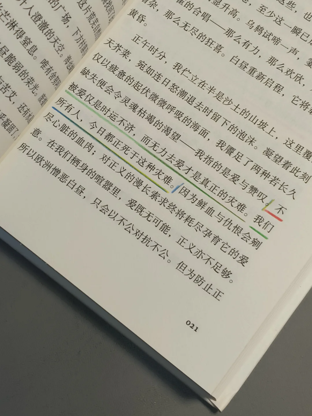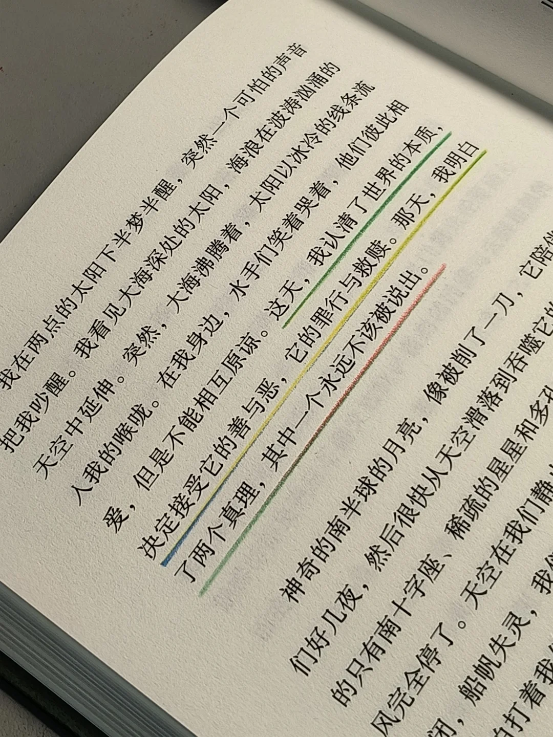 我终于明白行动、爱和受苦,其实是活着,但活要活得透明澄澈,并接受自己的命运不过是由各色喜悦和热情所造成的单一折射。