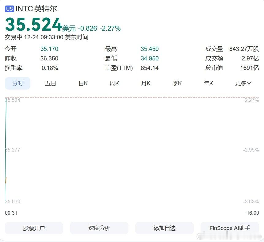 【耐克涨超3%英特尔跌3%】12月24日,美股三大股指小幅低开,道琼斯指数跌0.11%,标普500指数跌0.01%,纳斯达克综合指数跌0.02%。耐克开盘涨超3%,获苹果库克增持。英特尔开盘跌3%,传英伟达选择暂停对英特尔18A制程工艺的测试。注:12月25日(星期四)为美国圣诞节假期,12月24日(星期三)美股提前3小时,即于北京时间25日2点收盘;12月25日全天休市。(财联社)曝英伟达暂停英特尔18A工艺测试