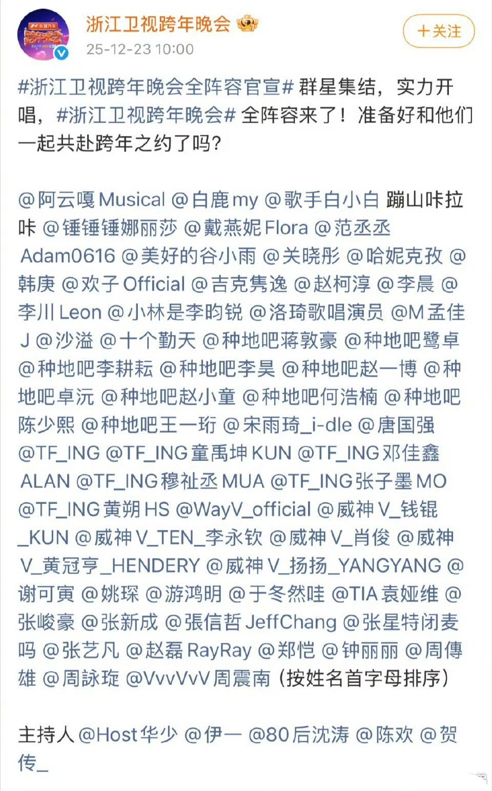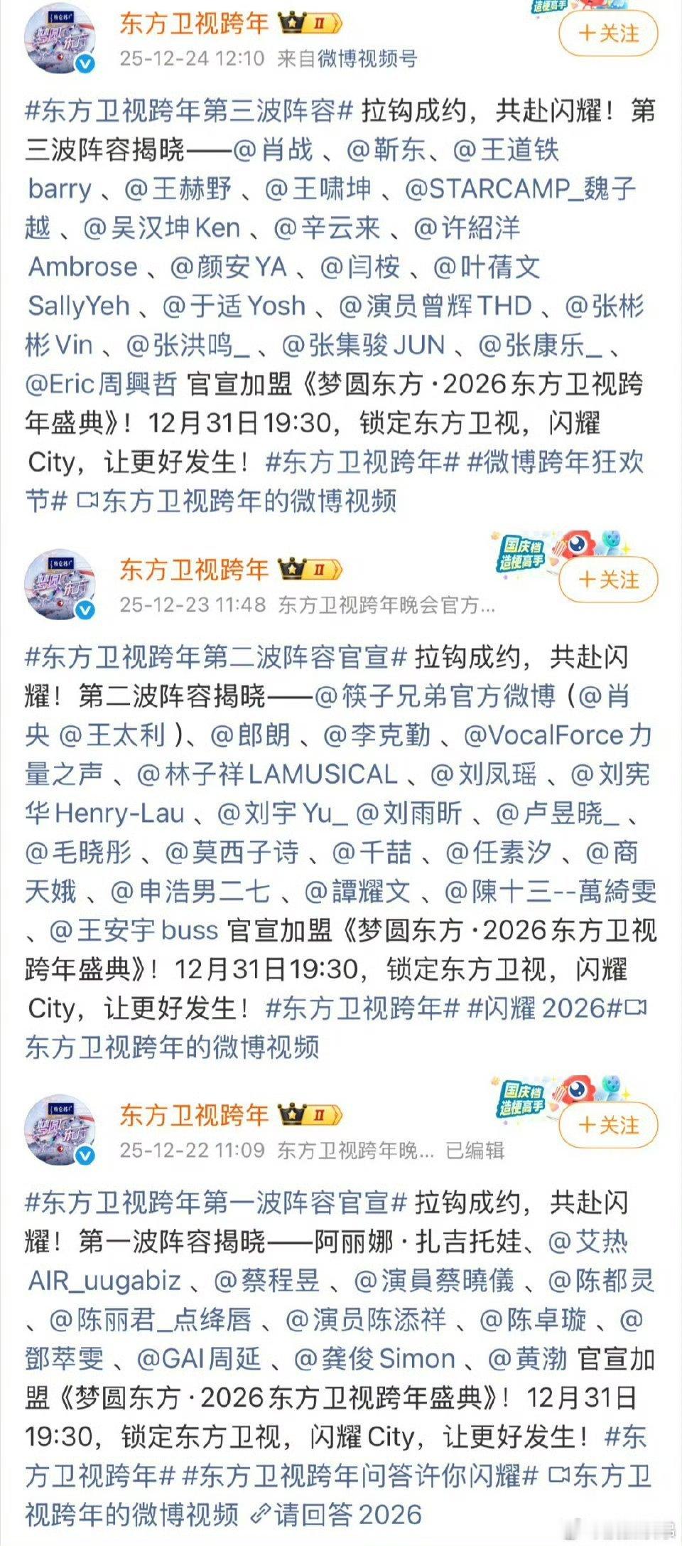 各卫视跨年晚会官宣阵容湖南卫视:陈楚生、华晨宇、黄景瑜、孟子义、沈月、时代少年团、宋威龙、檀健次、谭松韵、王楚然、王鹤棣、王嘉尔、张凌赫、张婧仪、章若楠 等江苏:登陆少年、刘宇宁、周深、任嘉伦、单依纯、曾舜晞、黄子弘凡、罗云熙、毛不易、薛之谦、张碧晨 等东方:肖战、陈都灵、陈丽君、龚俊、刘宇、刘雨昕、卢昱晓、王安宇、于适、张康乐 等浙江:阿云嘎、白鹿、范丞丞、关晓彤、李昀锐、十个勤天、TF_ING、宋雨琦、张峻豪、张艺凡 等