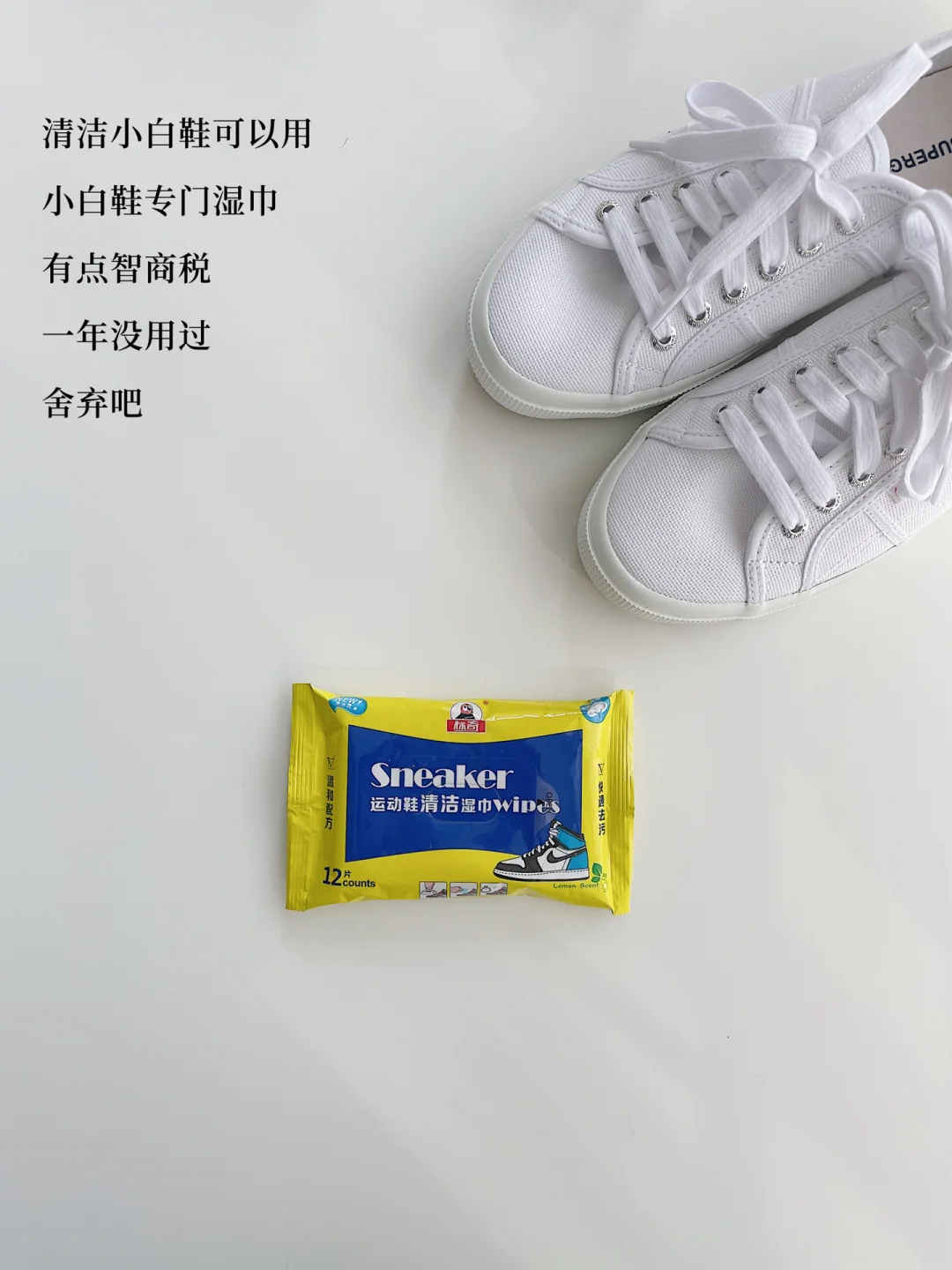 所以我断舍离了小白鞋清洁剂和漂白剂一份,湿巾一份。留下一份清洁剂和漂白剂,如果新一年还是没用过,我就扔了。