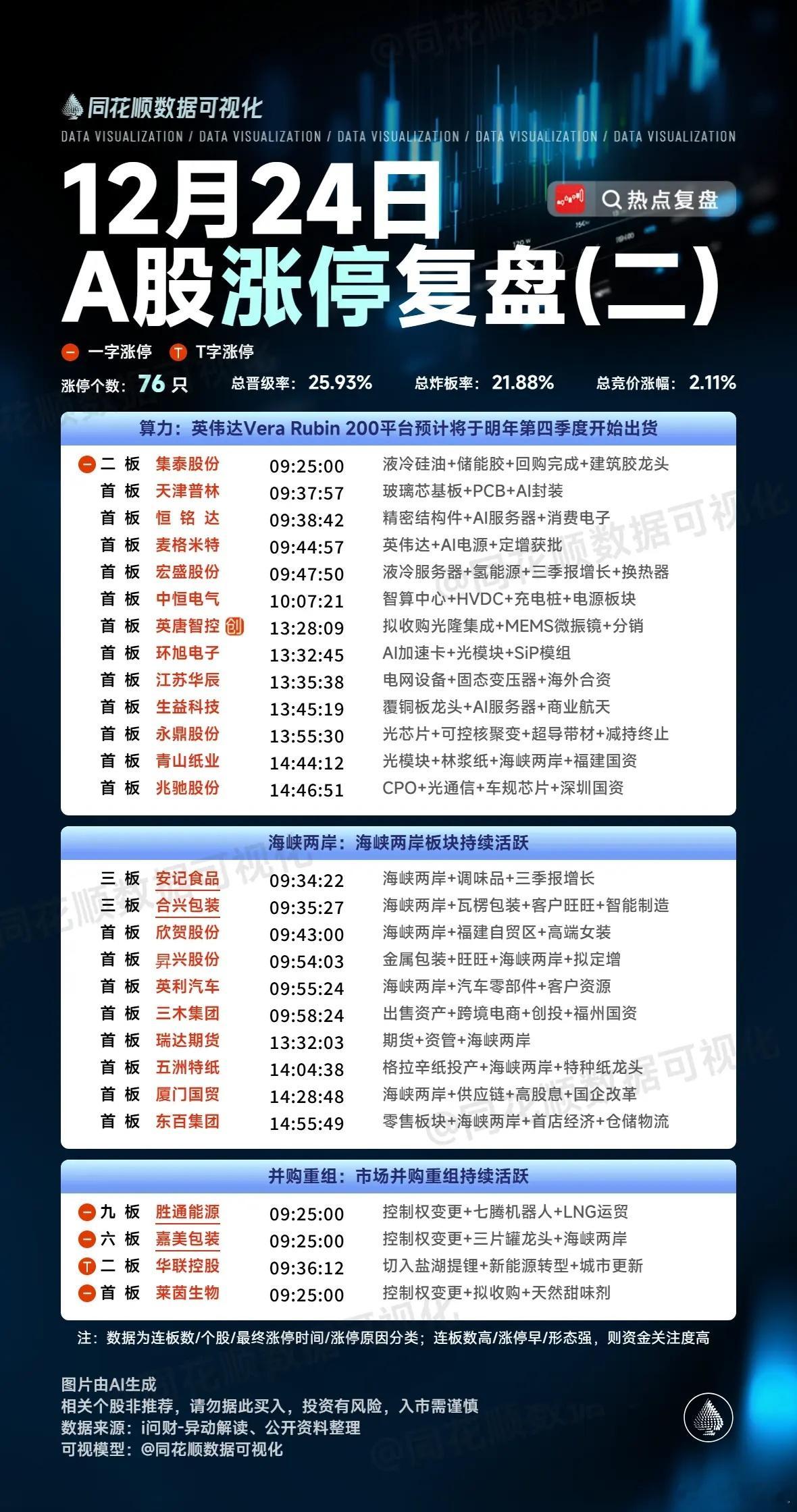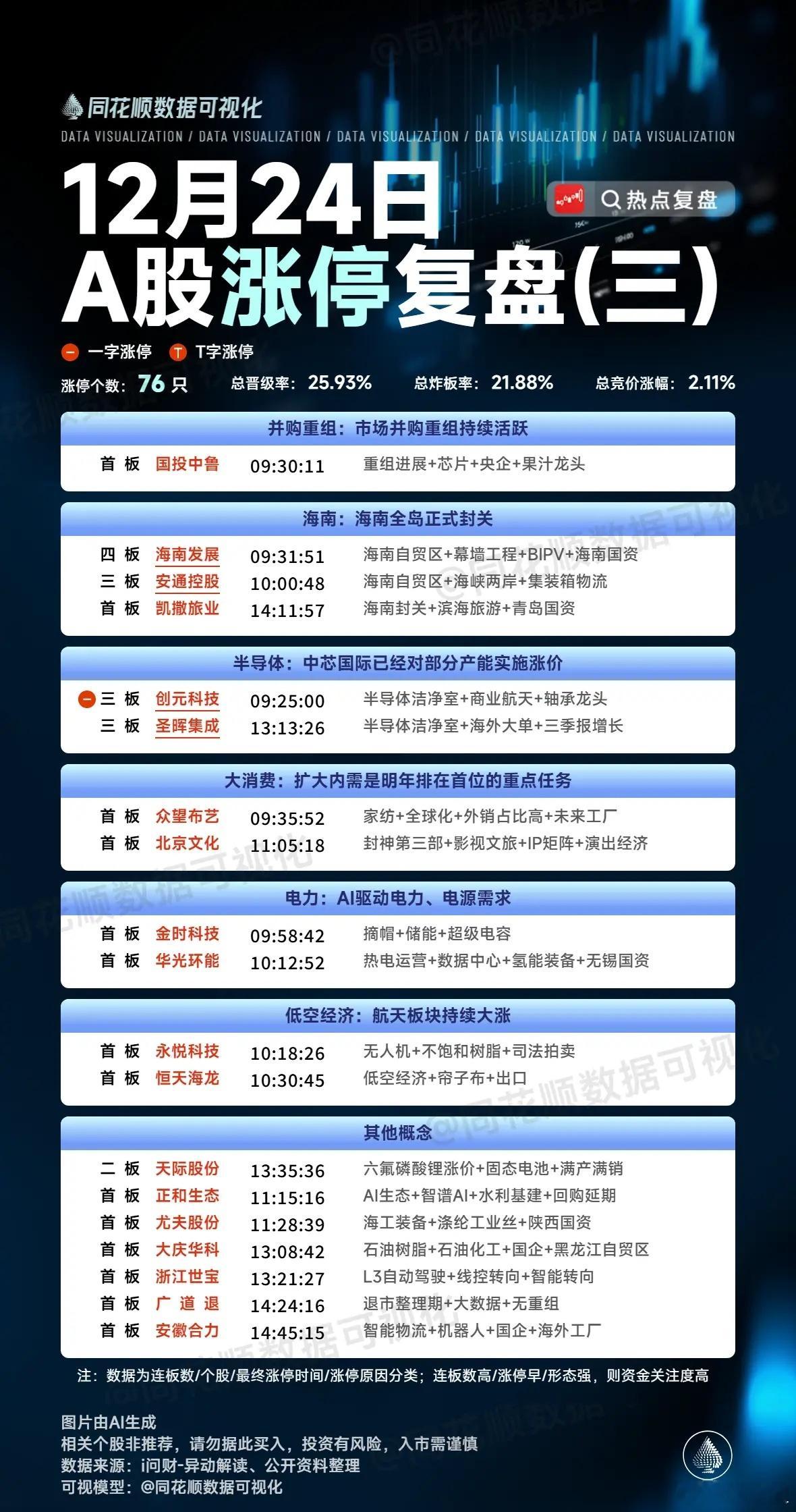 12月24日A股复盘:五家核心标的隔日走势前瞻分析在12月24日的A股交易中,东百集团、神剑股份、海南发展、天际股份、浙江世宝五只标的呈现差异化表现,结合盘面资金动向与板块联动效应,对其隔日走势研判如下:1. 东百集团(零售+福建)该股在周一完成反包后,受零售板块整体低迷影响,昨日呈现高位横盘态势。今日早盘竞价高开,开盘后资金快速拉升做多,尽管高位分歧显现,但承接力度强劲,推动股价触及涨停。不过,由于身处高位且零售板块整体表现疲软,仅百大集团与之形成共振,其余标的未能跟涨,导致该股涨停板上反复开板,尾盘甚至出现资金抢跑跳水,好在有资金及时承接,最终于竞价前封死涨停。盘后龙虎榜显示,买盘除知春路外多为量化资金,卖盘则是获利资金兑现离场,榜单整体表现良好,且此前持仓超2亿元的主力资金并未出现在卖盘。今日东百集团的拉升一度带动零售板块回暖,但板块后续乏力,尾盘百大集团在冲击严重异动时,被资金精准控盘于临界值之下。综合来看,该股虽以烂板晋级,但只要零售板块不出现集体负反馈、百大集团未发生跌停带崩行情的极端情况,后续延续趋势性走势的概率相对较高。2. 神剑股份(商业航天)昨日受长征12甲负面消息冲击,商业航天板块大幅回调,神剑股份逆势顶住分歧,最终以烂板收盘。今日早盘竞价阶段,恐慌资金出逃引发短暂承压,但在竞价尾声出现明显抢筹迹象。开盘后,商业航天板块迎来全面修复,作为板块最高标的,神剑股份获资金快速拉升,在板块普涨的助推下顺利封板,最终收出高位缩量涨停。盘后龙虎榜显示,吴中大道携手三家机构席位强势做多,卖盘以获利资金离场为主,值得注意的是知春路选择继续持仓。毫无疑问,神剑股份已成为本轮商业航天行情中市场公认的高标龙头。从今日板块高潮表现判断,商业航天赛道的行情并未终结,不过涨停个股呈现出明显的高低切换特征。参考此前年末机器人板块的轮动炒作路径,商业航天大概率将延续反复活跃的走势,而作为龙头的神剑股份,自然会成为资金抱团的首选标的。只要商业航天板块不出现显著负反馈,该股隔日加速连板晋级的预期较高。3. 海南发展(海南自贸区)昨日海南自贸区板块分歧加剧,最终仅少数前排标的成功晋级。今日早盘竞价阶段,板块整体表现疲软,除海南发展外,其余三只连板标的走势低迷,高开近8%的海南发展由此成为海南自贸区方向的核心标的。开盘后,该股顶住分歧压力,在资金强势承接下成功封死涨停。盘后龙虎榜显示,深南东路主导了本次拉升,成都系、建设三路及两家机构席位共同构成买盘主力,卖盘则为获利资金兑现离场。深南东路近期偏好布局连续一字板后大幅高开的人气标的,从龙洲股份、安妮股份到华菱线缆,均延续了这一选股思路,本次海南发展也是在多股竞争的环境中脱颖而出的强势标的。尽管海南自贸区板块整体表现不强,但海南发展依然稳稳封板,隔日冲高的概率较大,不过若想实现连板,必须得到板块的联动助力,否则大概率仅能收获高溢价。4. 天际股份(锂电)今日早盘,天际股份以4%左右的幅度高开,在锂电板块中表现突出。开盘后,电池板块整体上行,该股顺势发起冲击,完成首次封板。但由于锂电并非当下市场主流赛道,涨停板上抛压涌现,导致炸板放量,随后再次拉升才成功封死涨停。遗憾的是,锂电板块缺乏后排标的跟涨,天际股份涨停板上分歧持续加大,多次封板未果后承接力度减弱,不过股价始终未跌破早盘开盘价。午后,碳酸锂期货大幅拉升,带动天际股份获资金强势做多,最终以放量烂板的形态涨停。盘后龙虎榜显示,重庆解放碑、桑田路等游资买入金额均超1亿元,卖盘则是成都系、中山东路等短线资金获利离场,形成了良性换手格局。此次涨停有效解放了大部分套牢盘,隔日冲高的可能性较高,具体表现则取决于锂电板块能否形成共振。今日多氟多的表现同样可圈可点,若隔日碳酸锂期货延续强势,天际股份仍有看点,但在当前位置想要实现连板难度较大,除非板块迎来全面爆发。5. 浙江世宝(无人驾驶)今日早盘竞价阶段,浙江世宝获资金强势抢筹,大幅高开后快速拉升,在资金承接下触及涨停。但由于当前市场情绪聚焦于商业航天赛道,该股涨停板遭遇资金砸盘后,迟迟未能回封,直至午后才迎来资金回流,强势封板,走出亮眼的反包涨停走势。盘后龙虎榜显示,买盘以游资席位为主,卖盘抛压则主要来自深股通,整体换手较为良性。与天际股份类似,浙江世宝同样面临板块效应不足的问题,在当下市场量能萎缩的环境中,抛压相对较大,不过该股最终顶住分歧完成封板,隔日收获冲高溢价的确定性较高。但考虑到股价所处位置偏高,且无人驾驶板块缺乏强劲表现,想要实现连板晋级仍存在不小的难度。