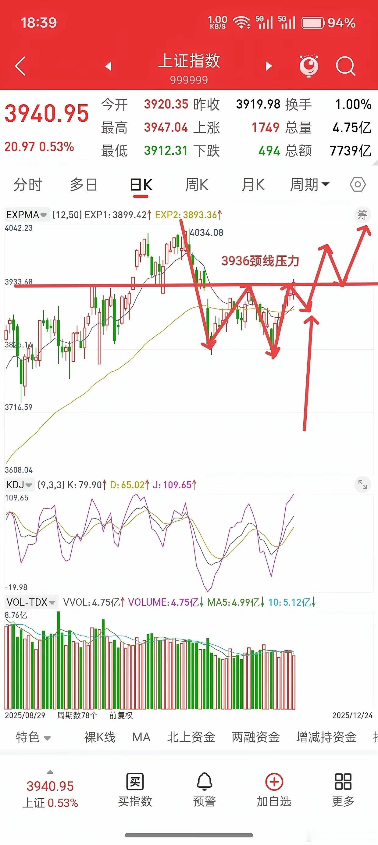 A股,从明天起,是新一波行情反转,还是诱多?先说观点,如果明天回踩不破3936颈线,且成交量不缩量,行情就可以看反转,且回踩3936附近,就是二次上车机会。后面反弹高度,看3985,甚至前高4034。如果明天跌破3936,或者缩量,以及收盘站不上3936,那基本上可以确定,反弹阶段结束,看新一波洗盘,洗盘位置看3900,也就是说3900附近,可以分批低吸。基本情况就这样!
