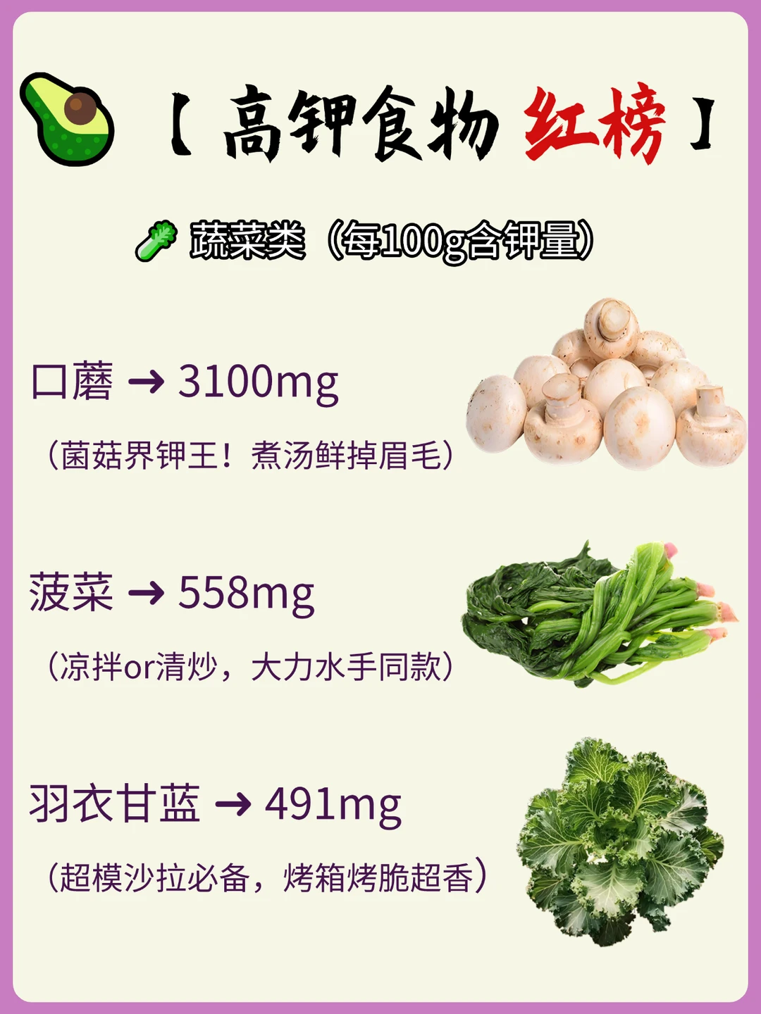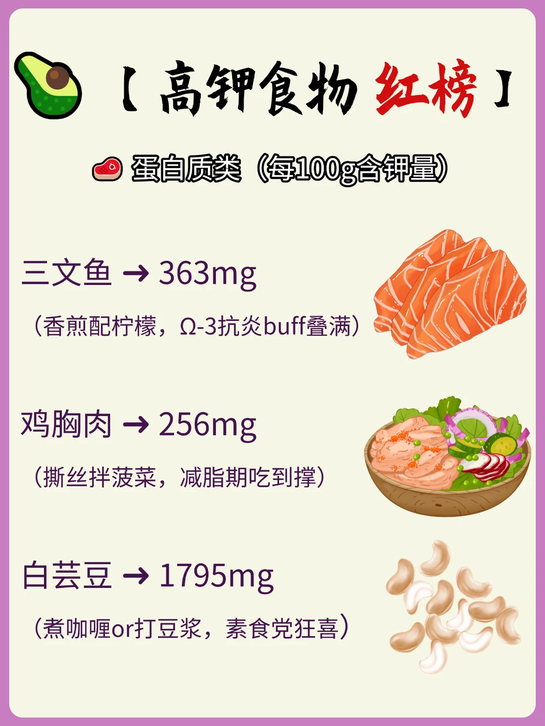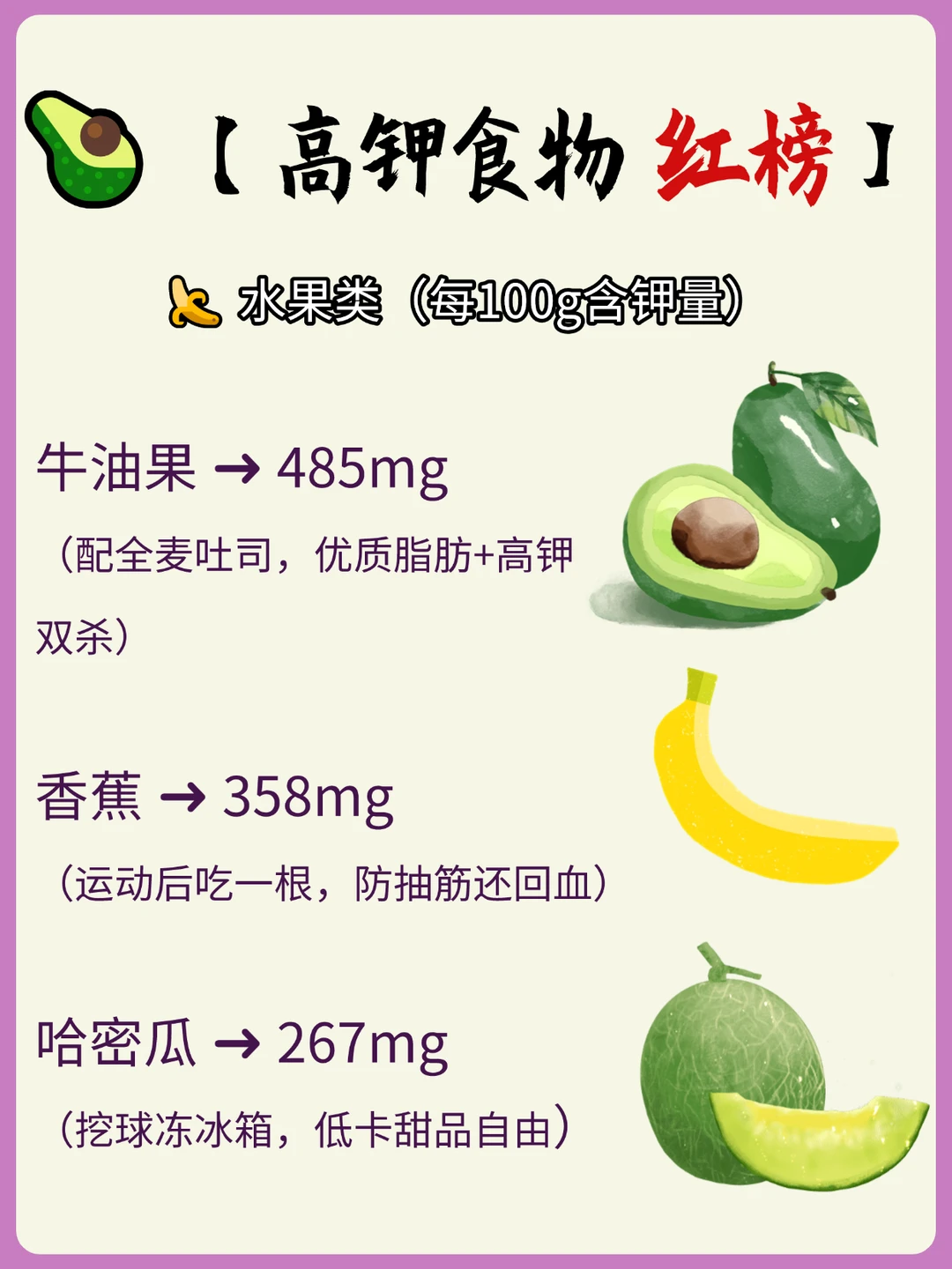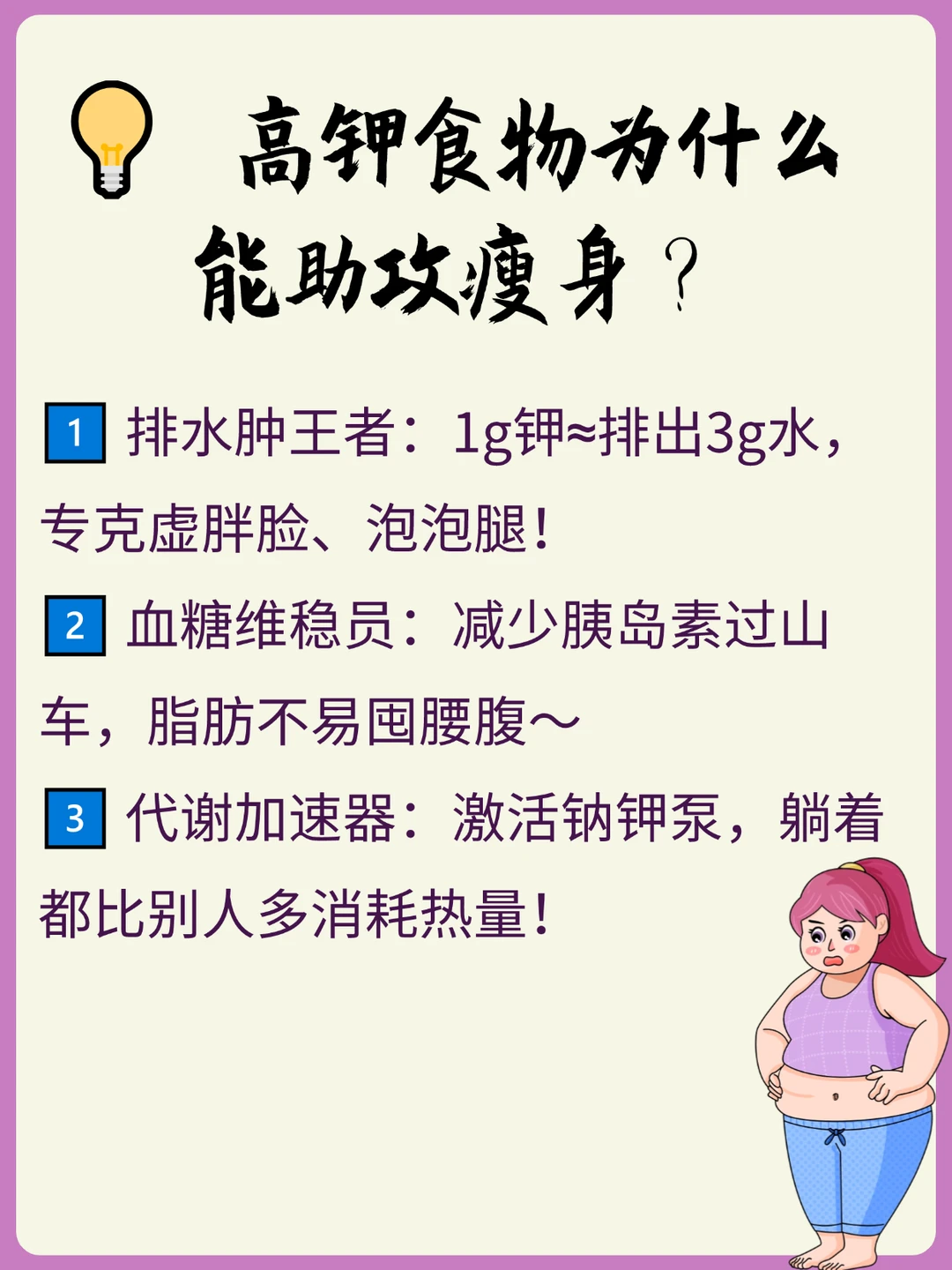 “明明吃得少,却总瘦不下来?可能是身体在缺钾!” 谁说瘦身只能靠饿?选对高钾食物—— ✅ 消水肿 ✅ 稳血糖 ✅ 拉代谢 躺着也能让身体主动燃烧卡路里 🔥 附「高钾食物红榜+懒人搭配公式」,看完直接抄作业! 🌟 重点提醒: ⚠ 肾功能异常者需控制钾摄入,遵医嘱! ⚠ 高钾食物需均衡搭配,别狂炫单一食材~