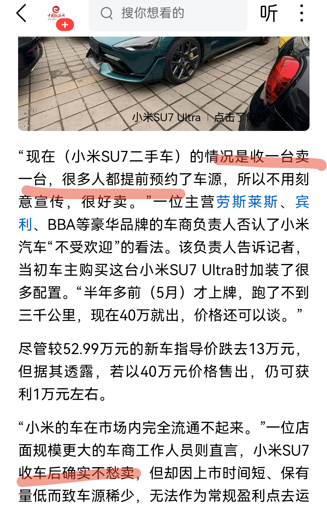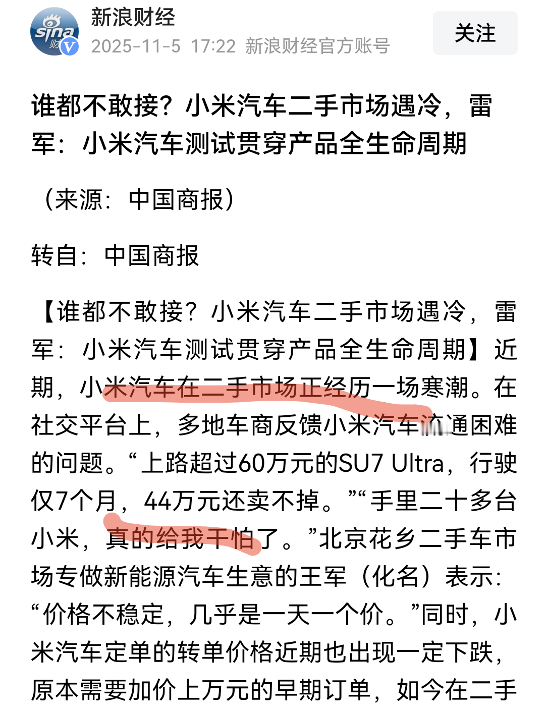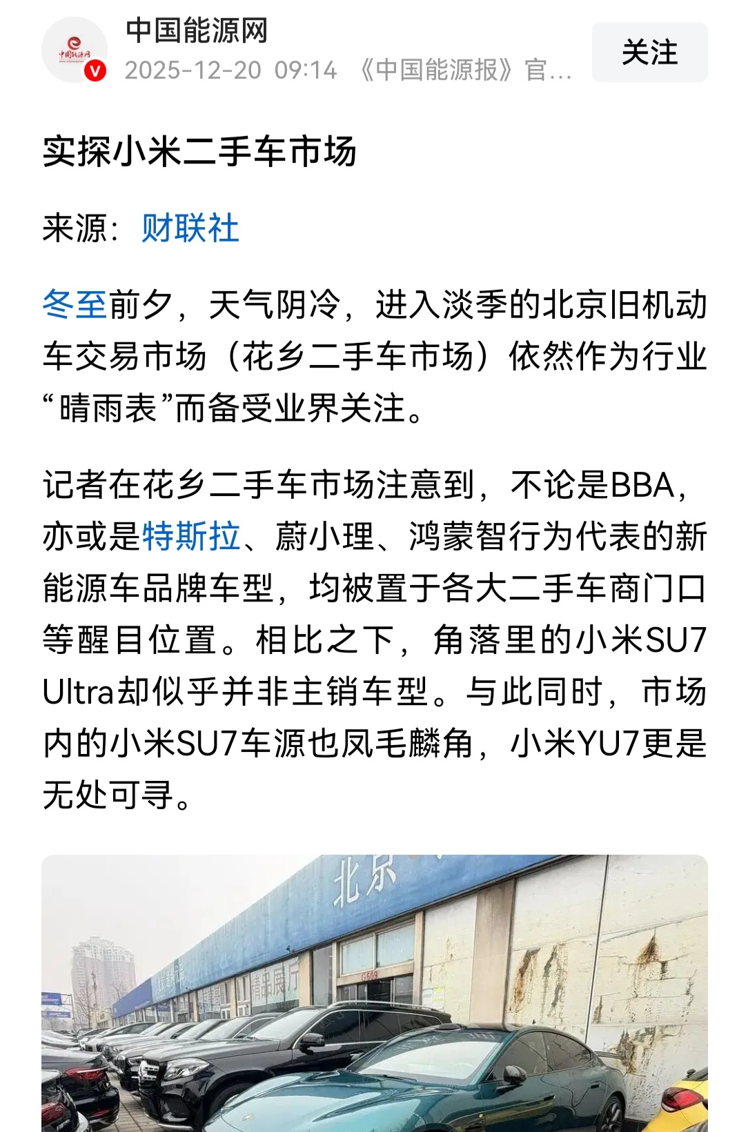 中国能源网转发财联社的文章,关于小米二手车市场遇冷的说法,那是假的。根本不愁卖,基本上是来一辆卖一辆,早就被预定了。