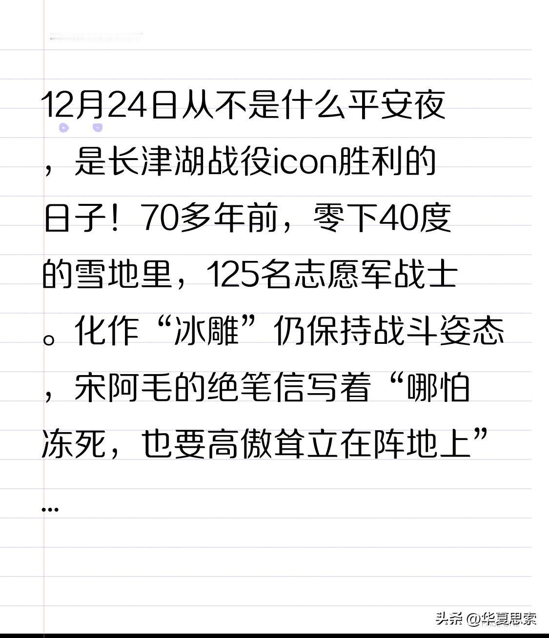 12月24日从不是什么平安夜, 是长津湖战役icon胜利的日子! 70多年前,零下40度的雪地里,125名志愿军战士。 化作“冰雕”仍保持战斗姿态,宋阿毛的绝笔信写着“哪怕冻死,也要高傲耸立在阵地上”。 他们用冻僵icon的手紧握钢枪,粉碎了美军icon“圣诞节回家”的妄想, 2025年有人忙着 过圣诞、 吃“平安果”, 可别忘了这和平是谁换来的。