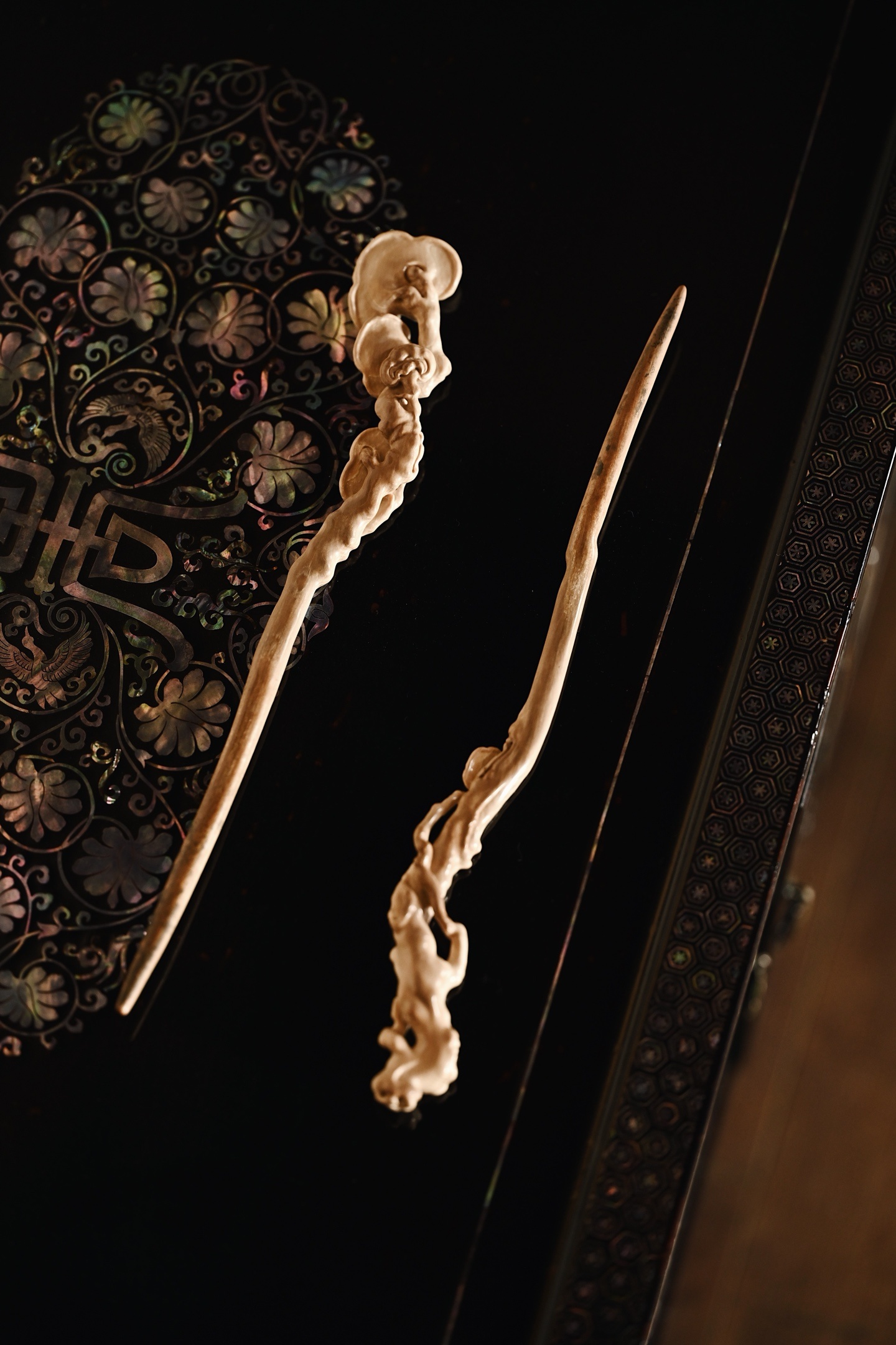 猛犸 | 灵芝 发簪 择取咖料,色泽沉稳,形制简约,雕刻灵芝层叠分明,发簪纤长玲珑,固冠于发,绾青丝作云髻,具国风雅韵。大灵芝21*3.5*1cm 22g小灵芝21.5*3*1cm 17g
