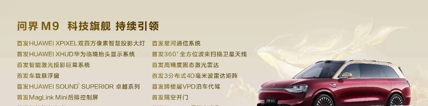 问界、问界M9;问界汽车(AITO)的核心优势可总结为以下四点,深度结合华为技术赋能: